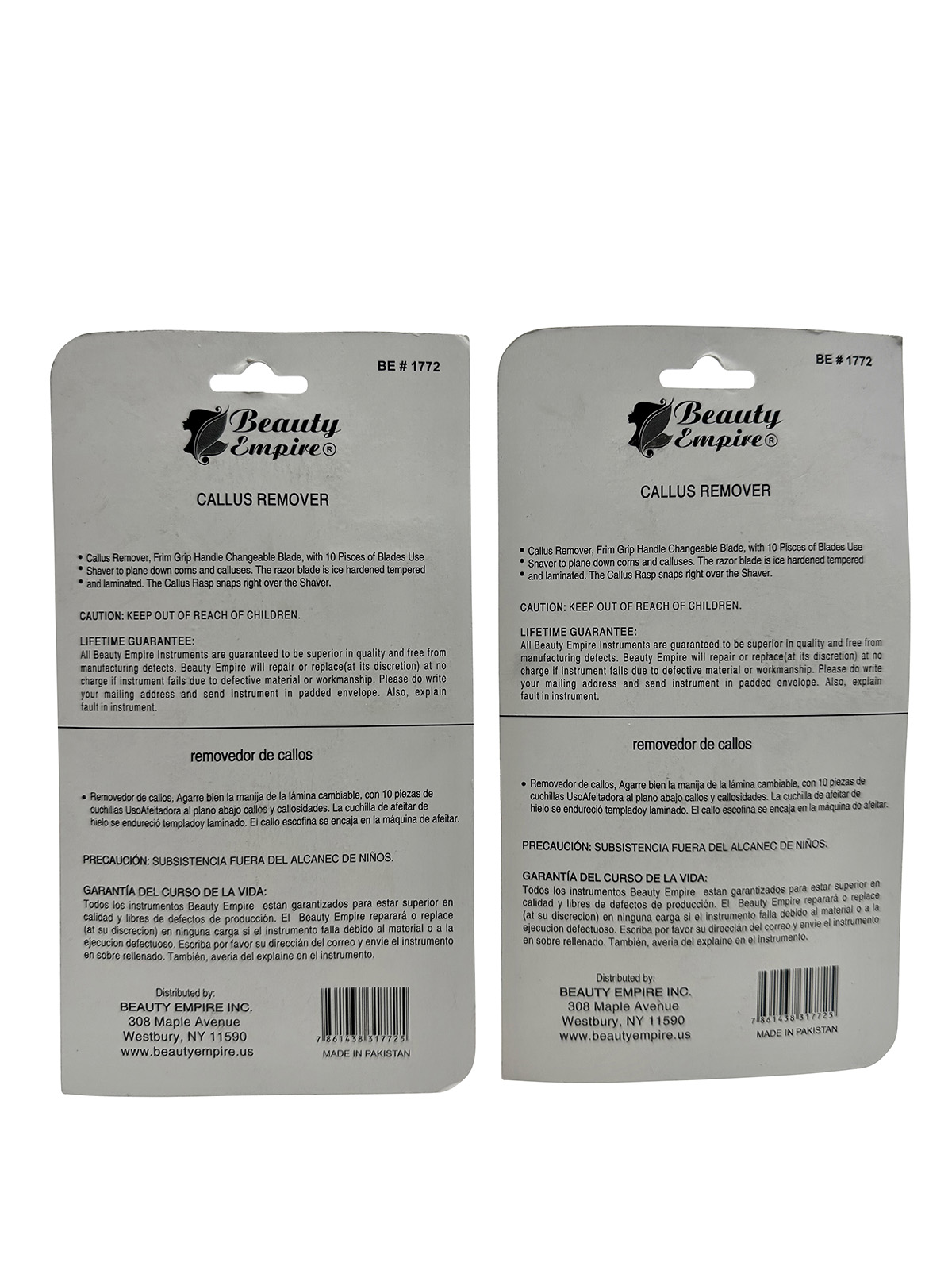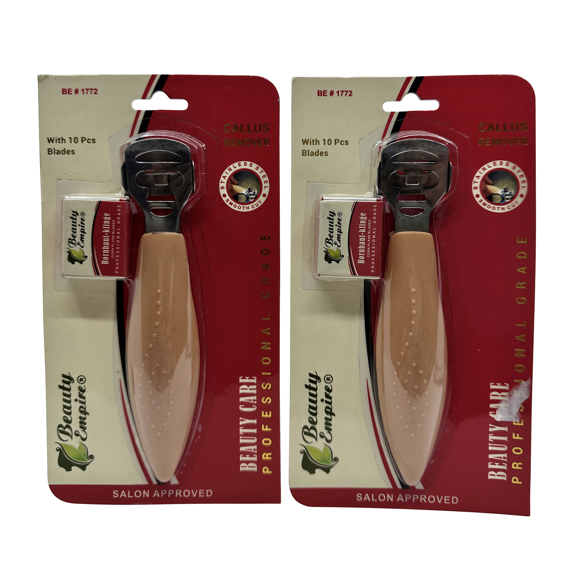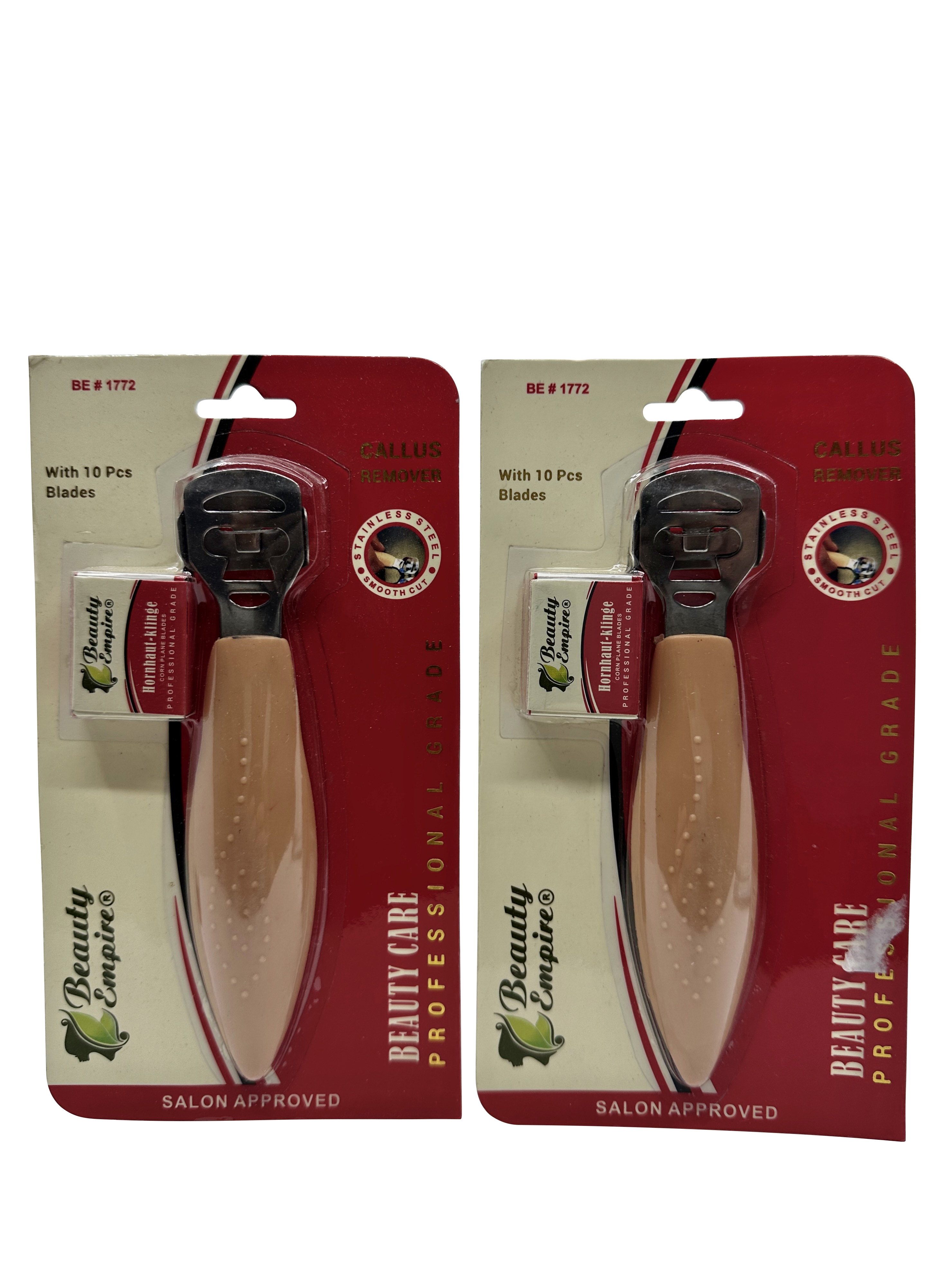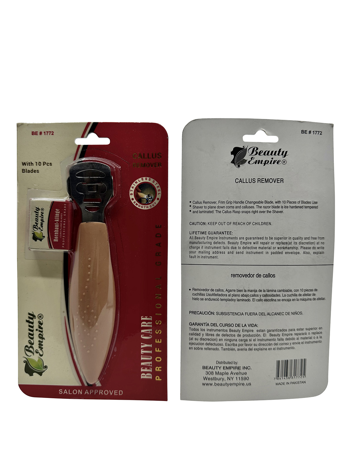 Beauty Empire Callus Remover helps you maintain your feet callus free in the comfort of your home. Created to help remove or reduce calluses on feet. Calluses are thickened, hardened areas of skin that develop as a result of repeated friction or pressure. They often occur on the soles of the feet or the palms of the hands. Rust resistant and professional grade. Made of stainless steel. Comes with 10 extra blades. How to use: Use tool on clean feet. To clean is to boil for 30 minutes, soak in with rubbing alcohol or hydrogen peroxide, or wash them with soap and water before wiping them down with rubbing alcohol.