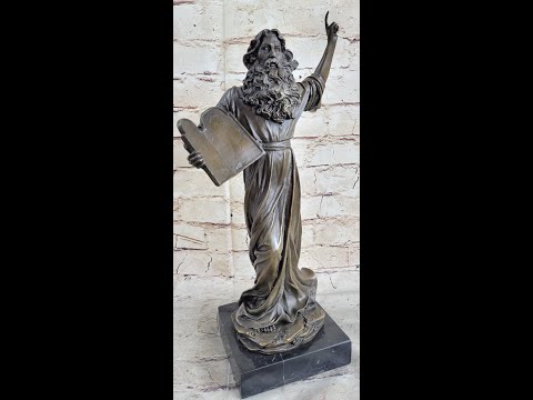 This remarkable bronze statue portrays the iconic moment of Moses descending from Mount Sinai with the sacred tablets containing the Ten Commandments. With a long beard and a flowing robe, Moses exudes wisdom and strength. The artist has captured the essence of this biblical figure, showcasing his dramatic gesture as he presents the divine laws to the Children of Israel. Mounted on a sleek marble base, the statue stands at an impressive height of 12 inches.