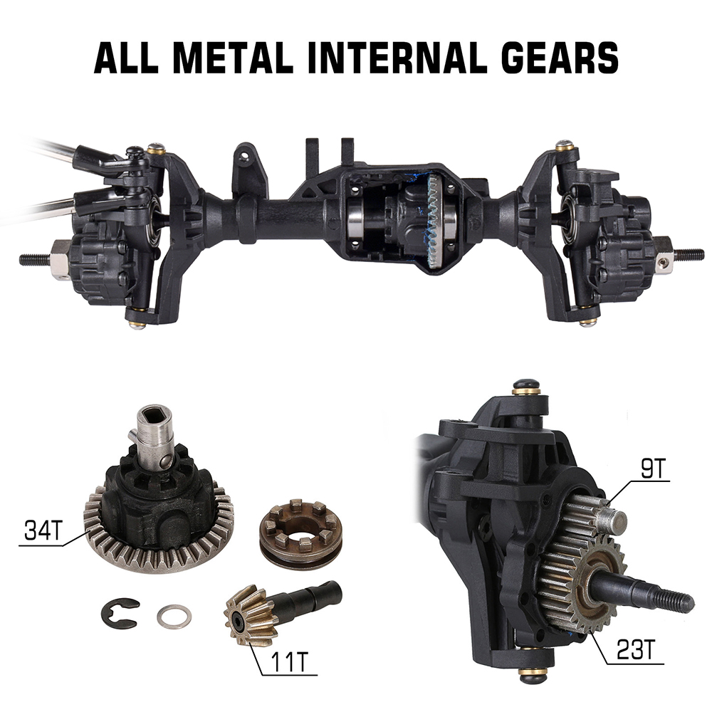 Metal internal gears and driveshafts. Heavy duty steering linkage set for added durability. Axle design further improves the chassis, enhancing hill-climbing and off-road performance. Suitable for RC car enthusiasts
