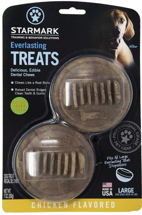 Starmark Treats are made from natural ingredients without plastics or polymers and are edible and digestible with an irresistible taste. These treats can be eaten as a snack, or use them inside the Starmark Mental Stimulation toys to create hours of mental and physical stimulation. The Everlasting Treats are long-lasting dental chews that are hard like a bone to help keep your dogs teeth clean. Pair them with the Starmark Everlasting Treat toys for challenging chewing fun.