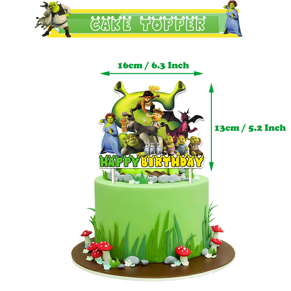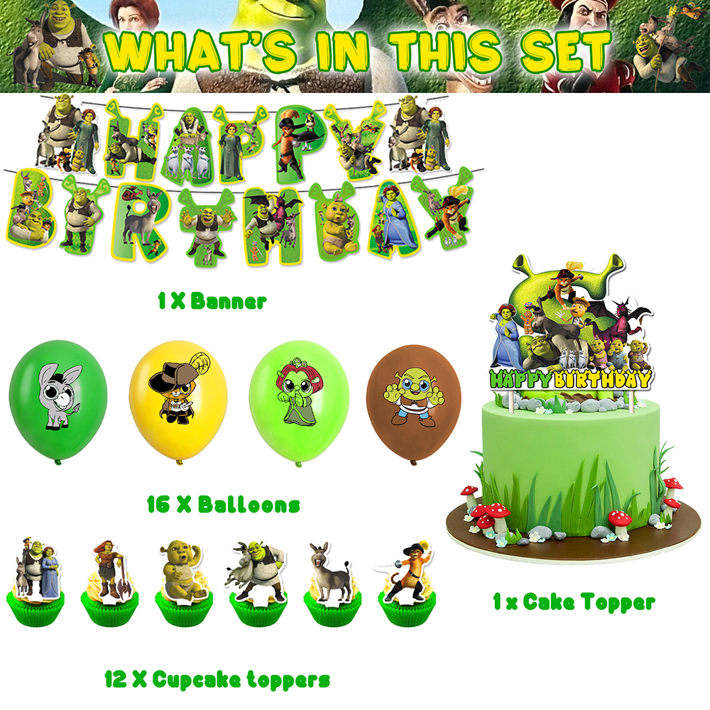 1x Happy Birthday Banner,1 x large cake topper, 12 x small cake toppers, 16 x Shrek latex balloons, with bright colors and a cute design.