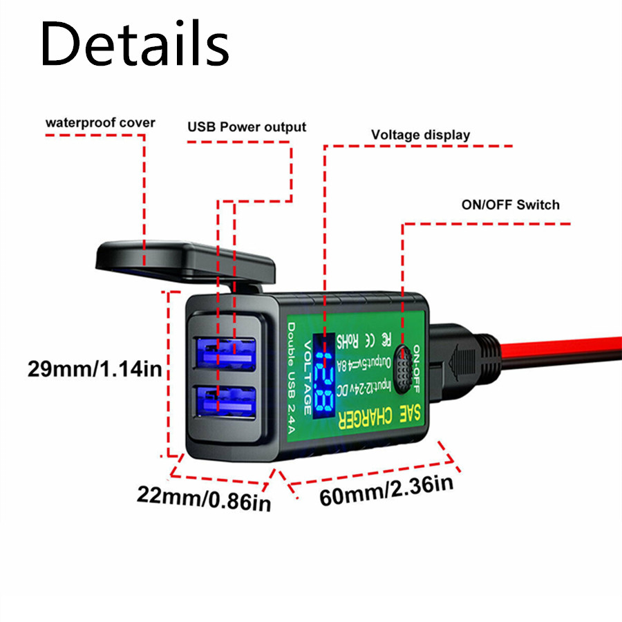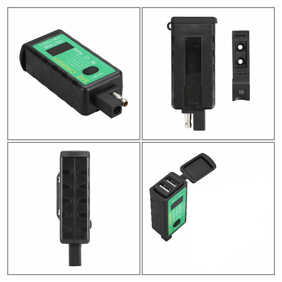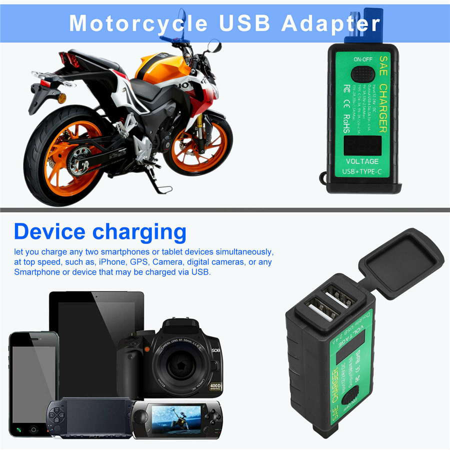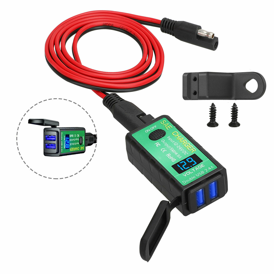 Motorcycle USB Charger SAE to Dual USB Adapter Voltmeter ON/Off Switch Waterproof