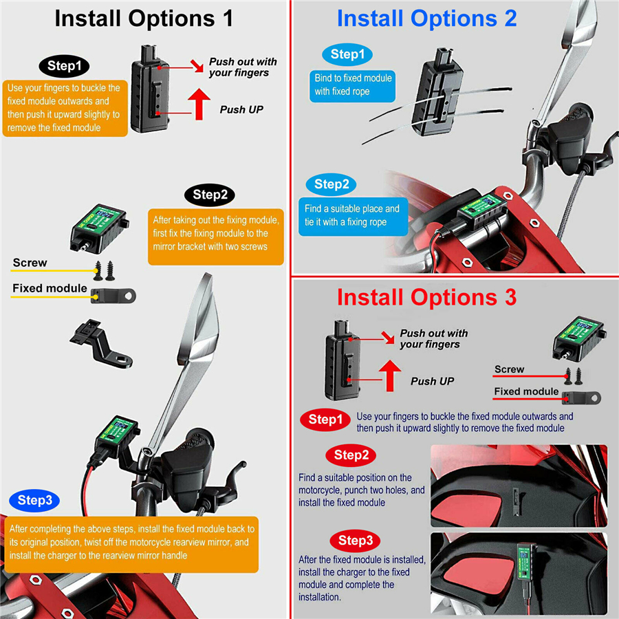 【What's Upgraded】This Motorcycle USB Charger innovative on ON/OFF switch and three installation methods (see chart), features energy-saving and devices protection, prevent the battery from being drained. Three installation methods meet your different needs for installation.