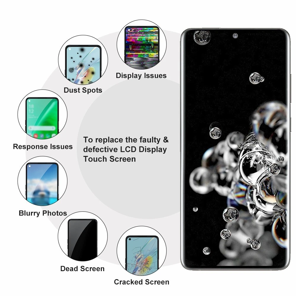 【Attention】This module is a Screen replacement For Samsung Galaxy S20 Ultra 5G , Please do not use it for other models. 【Quality Guarantee】Each part was double tested by technicians before packing and shipping, which is tested to ensure the elimination of black screen, static lines, white dots, uneven colour, and other technical issues. 【Easy Installation】It is easy to install and a perfect fit. However, please check the tutorial video on YouTube before installation or have a professional to do it as damage during installation is not covered by warranty.