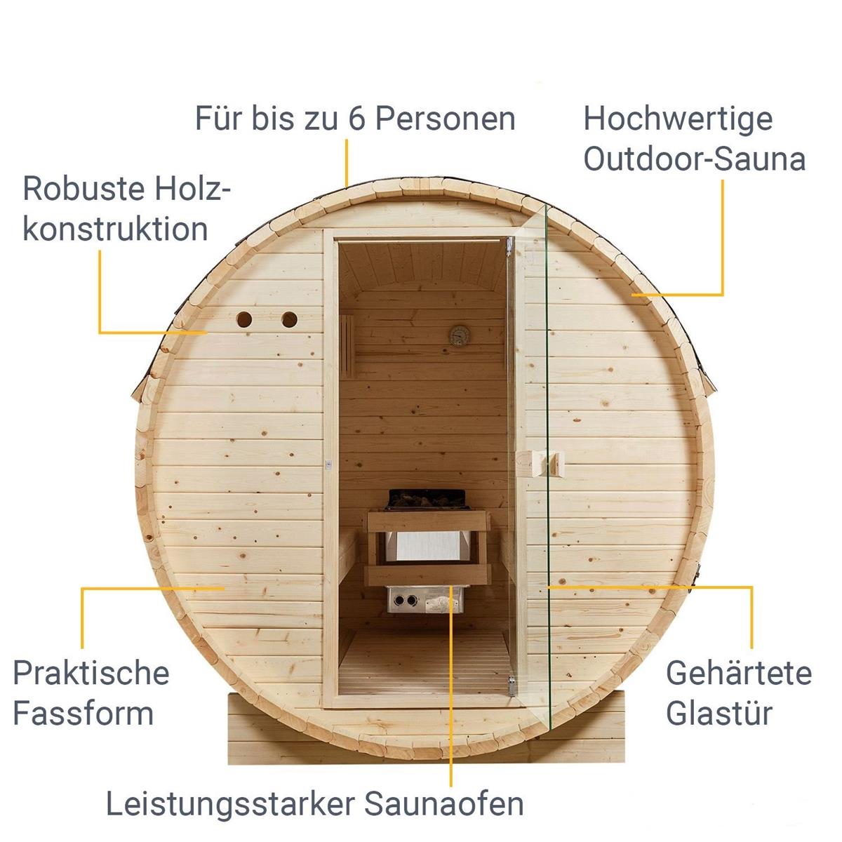 Holen Sie sich Ihren Wellnessurlaub jetzt einfach nach Hause! Diese Fass Sauna lädt Sie zum Entspannen und Relaxen ein. Erhöhen Sie Ihre Lebensqualität durch Erholung in den eigenen vier Wänden. Die moderne Form macht das Saunieren auch optisch zum Genuss.