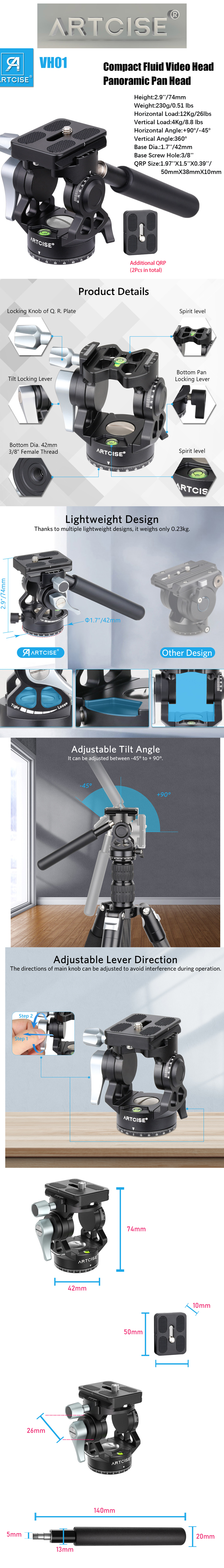 【Lightweight and Potable Design】: the body of the compact mini video head to increase the hollow pattern lightweight design, weight only 0.23Kg, height of 74mm, For you to save space in your travel bag