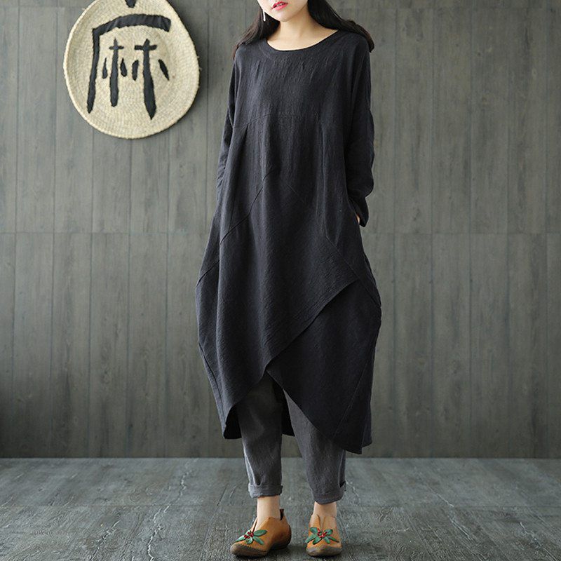 Features:Women Autumn Casual Vintage Cotton Linen Long Sleeve O Neck Pockets Asymmetrical Hem Dress