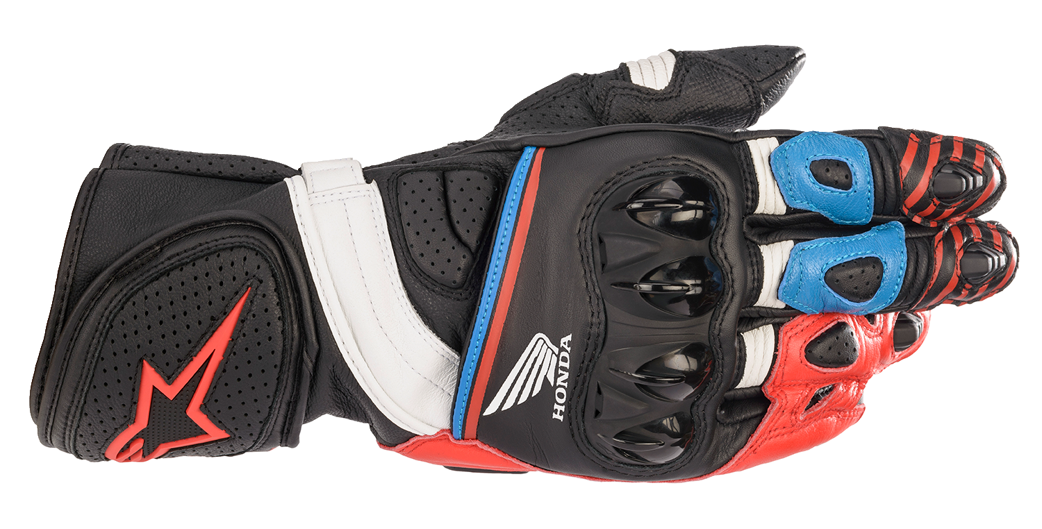 Protective double cuff closure with TPR logo wraps around wrist, raising the entire profile of the glove to protect the wrist bone from impact in a crash