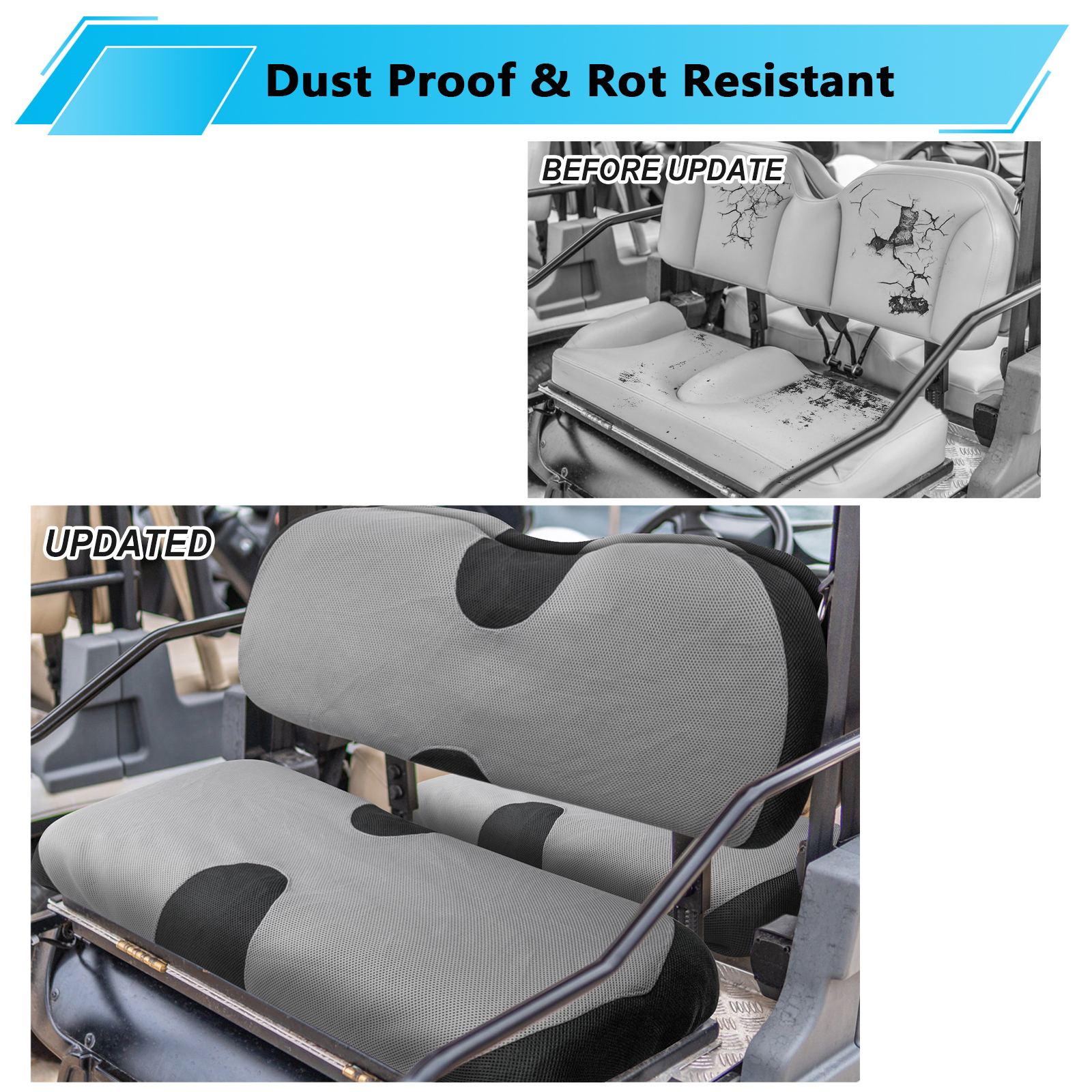 【Extends the Life of Your Seats】 Our golf cart seat covers protects your seat against spills, stains, fading, tearing, dirt, crumbs, pet claw marks and fur, sun damage and wear.