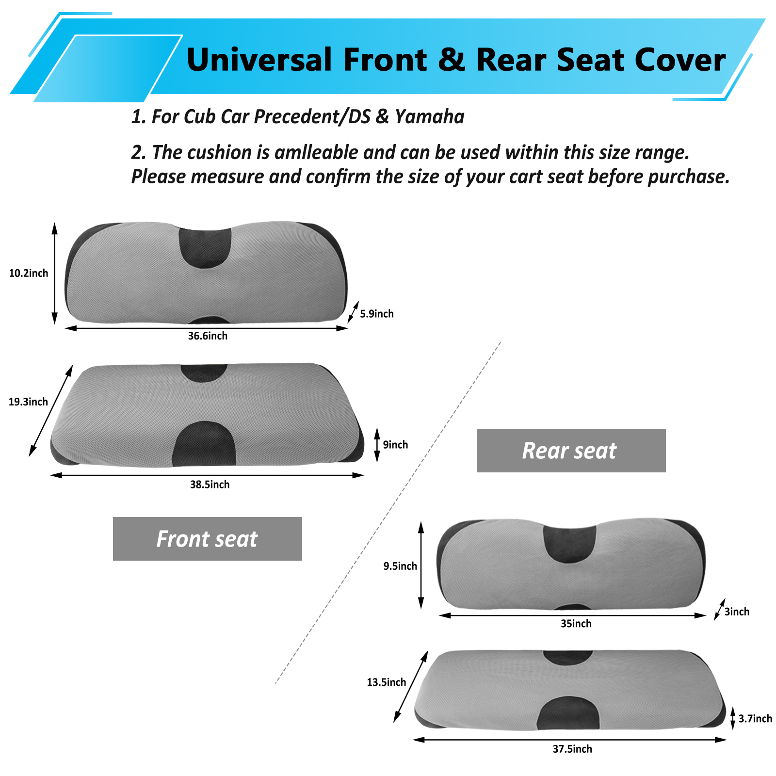 This seat cover set is universal size, suitable for most standard 4 (2+2) passenger golf carts such as Club Car, EZGO TXT RXV, Yamaha and more. (NOTE: If your seat has been thickened, widened and upgraded, please measure your cart seat size to ensure the covers fit.)