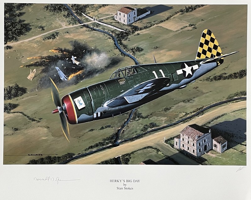 The Republic P-47 Thunderbolt, or Jug7 as it was more popularly called, was the mount of many of the American aces of WW 11. The P-47 represented the crowning achievement from two aircraft designers, Alexander Kartvelli and Alexander De Seversky, both immigrants from Russia. It came on the heels of two other aircraft, the P-35 and P-43, which were satisfactory pre-war designs, but not up to the new standards required to compete against Bf-109 fighters in Europe or Mitsbushi Zeroes in the Pacific. The P-47 was the largest and heaviest single seat American fighter of the War. Powered by a huge 2000-HP radial engine, more than 15,000 Jugs were produced. The first production variant was the P-47B which had a razorback fuselage. During tests the aircraft attained a speed of 429-MPH with a maximum range at 10,000 feet of 835 miles. Later variants included a C and D model with the razorback fuselage. Belly tanks and wing tanks became standard equipment as the range of this fighter was stretched for bomber escort missions in Europe. In mid- 1943 one of the biggest pilot complaints about the aircraft was remedied when a bubble top canopy and redesigned fuselage was incorporated into the D model. This dramatically improved rearward vision of the pilots. These aircraft were armed with 8 machine guns, and could carry up to 2500 pounds of additional fuel or ordinance. Herschel Herky Green was one of the top USAAF aces in Europe with a total of 18 confirmed aerial victories (3 in P-40s, 10 in P-47s, and 5 in P-5 Is.) Green was born in 1920 in Mayfield, Kentucky. While studying mechanical engineering at Vanderbilt University he learned to fly in the Civilian Pilot Training Program. He joined the Army as an aviation cadet in 1941 and earned his wings an a commission at Foster Field in 1942. One of Greens first assignments was flying P40s in North Africa. He scored a total of three victories in P-40s before his squadron transitioned to the Jug. As depicted in Stan Stokes painting, appropriately entitled Herkys Big Day, Green downed six enemy aircraft on one mission over Northern Italy on January 30, 1944. Greens flight initially encountered a group of Ju-52 transports, and Green bagged four of them. About thirty minutes later the ace encountered a lone Macchi 202. In a low level turning duel Green eventually got in position and nailed the Italian fighter. Its wing dipped, caught the ground, and sent the Macchi into a terrible cartwheel of destruction. Heading home Green encountered a Do-217, which quickly became victim number 6. Green went on to later add four more P-47 victories, and after his group changed to the P-51 he scored an additional five, making him an ace in both the Jug and the Mustang. Green remained in the Air Force following the War, serving as Deputy Commander of the 4th Fighter Group at Selfridge Field. He also held a number of important staff positions prior to his retirement in 1964. Since that time he has been a successful businessman. Greens numerous decorations include the Distinguished Service Cross, Silver Star, Distinguished Flying Cross with Oak Leaf Cluster, the Purple Heart, The Air Medal with 25 Oak Leaf Clusters, and the French Croix de Guerre with Palm. Green resides in Southern California.