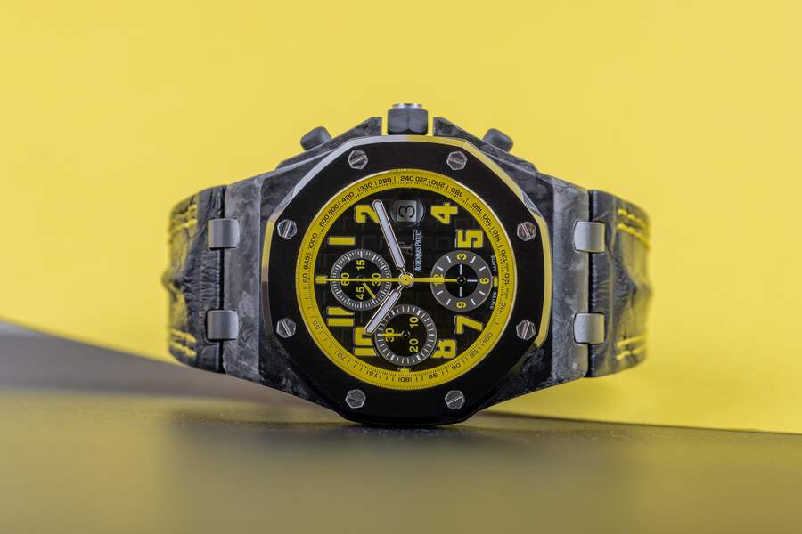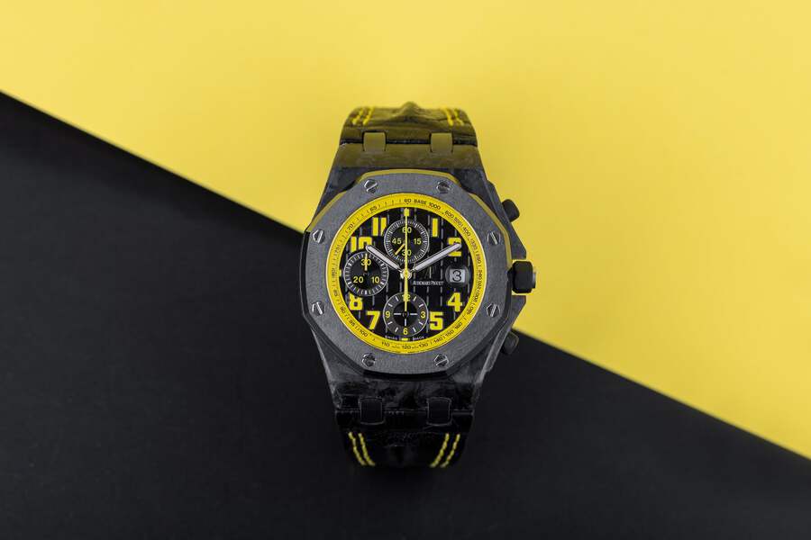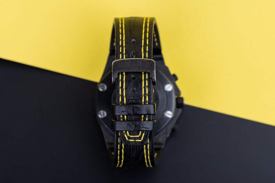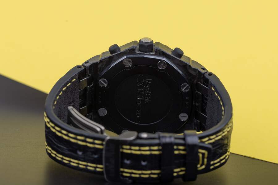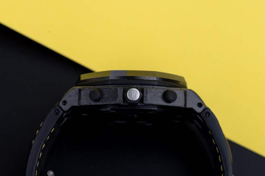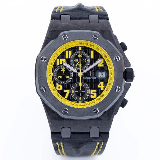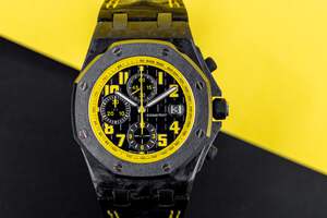 Pre-owned, excellent condition Audemars Piguet Royal Oak Offshore 'Bumble' reference 26176FO.OO.D101CR.02 gents Carbon case wristwatch. Black dial, yellow Arabic numeral hour markers, date display at 3 o'clock, 3 chronograph sub-dials, a Carbon 42mm case, black ceramic bezel, ceramic winder and pushers with rubber coating, a blackened Titanium clasp, a brand new Audemars Piguet leather strap with yellow stitching, sapphire crystal glass and automatic movement.