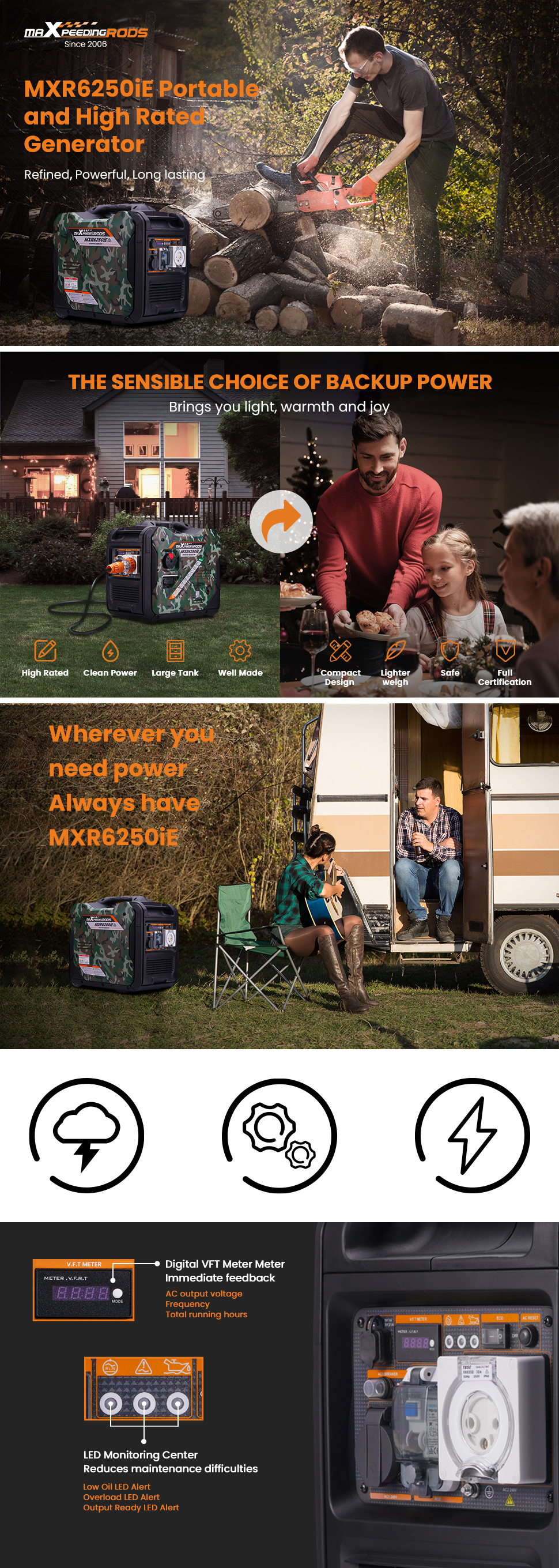 5. Quiet operation of 68dB comparable to the sound of a normal conversation, perfect for RV travel, family power, jobsite use, etc.