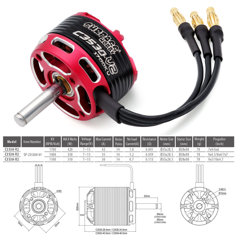 C35 Series V2 brushless motor ESC combo set for RC Fixed Wing Plane. 14 pole, CNC machined 6061-T6 heat sink, excellent heat dissipation; profession, with excellent start-up,acceleration and linearity features, strong resistant current capability.