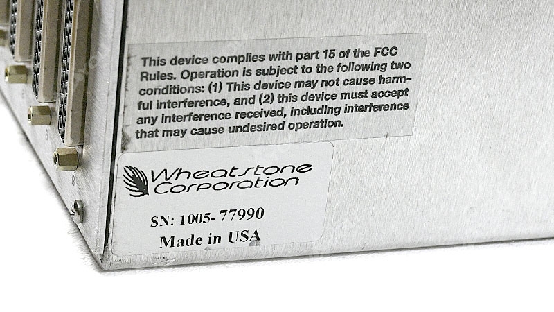 For sale is ONE (1) used bridge router / mix engine for Wheatstone consoles. Good working condition guaranteed. List of the cards - depicted on the last photo. Some minor scratches/scuffs and small dent on front cover, see photo. Actual photos are showed. Chassis comes with two power supplies. Power cords are not included unless otherwise mentioned.