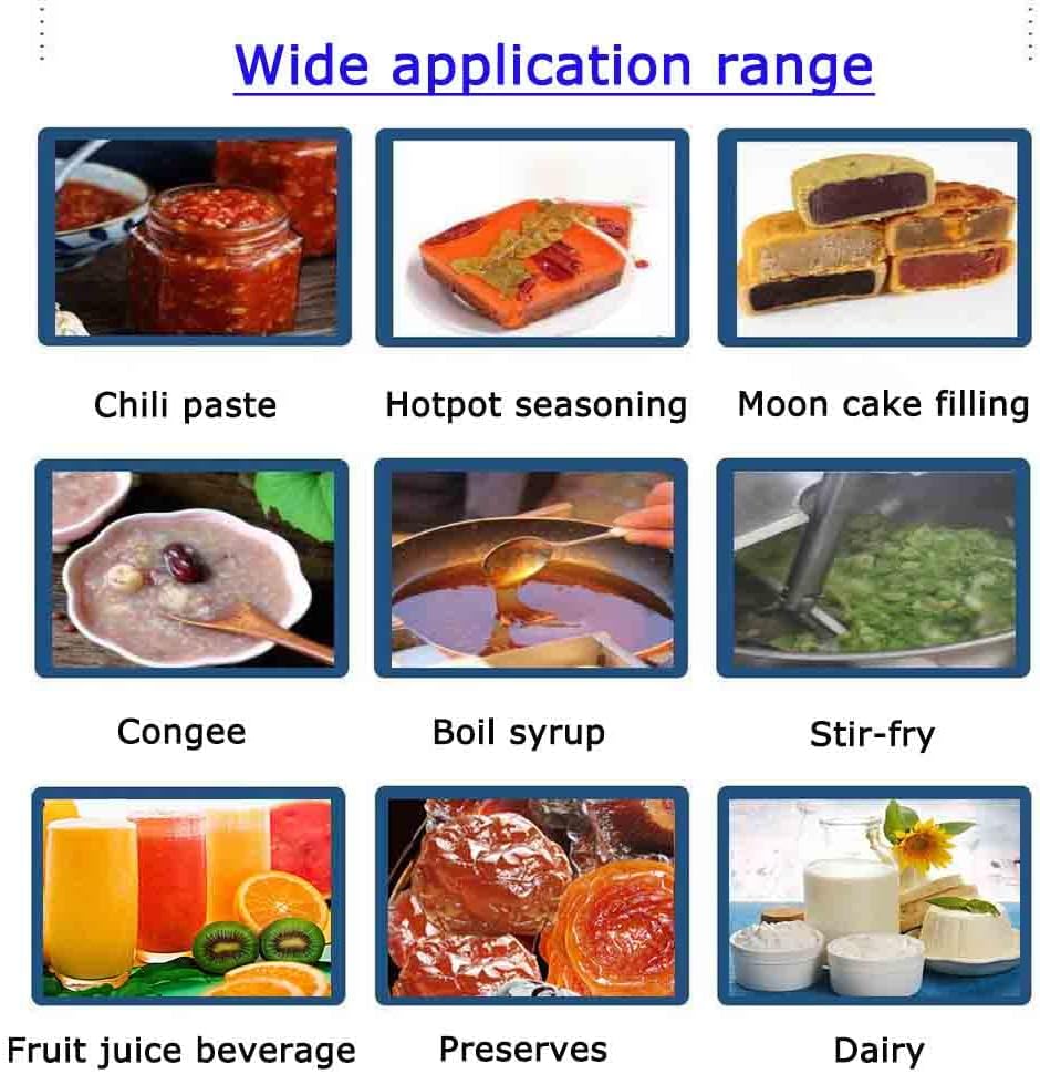 Jacketed kettle is widely applied in all kinds of food processing, candy, syrup, lotus paste, bean paste, jam, sweetmeats, pastries, drinks, candied fruit, can, fruit jam, beans, popcorn, jujube paste, sauce, curry prepared food and daily chemical industry, and other industries, mixing and dairy, wine, and other food processing.