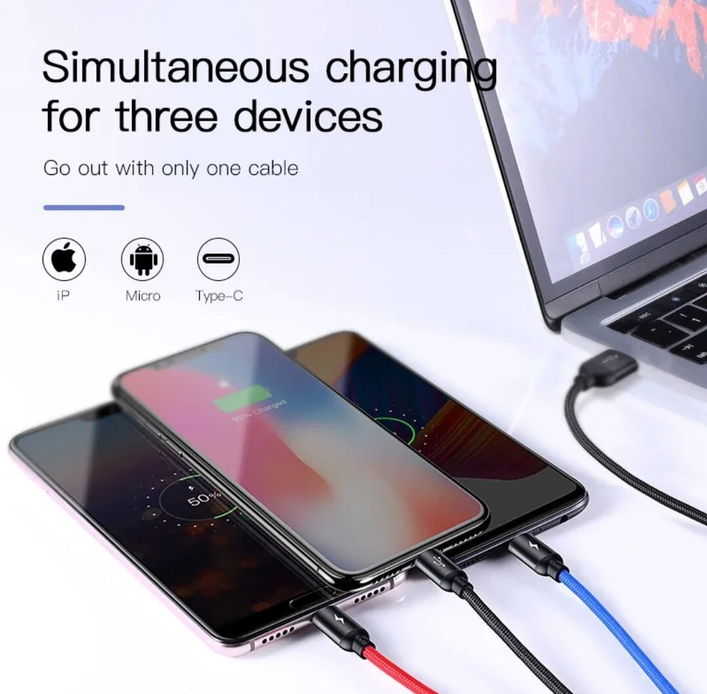 Description 3 in 1 USB charge cable for IOS Android Type C charger for iPhone 5 6 7 8 X iPad, type C and Android Durable and Multi functional 3 in 1 Charging cable includes Micro USB, USB type C Can charge your iPhone/Android phone at one time Compatible Model Compatible with both Apple iOS and Android system devices: including iPhone 7/ 7 plus /6 / 6 Plus / 5s / 5c / 5, iPad Air / Air 2, iPad mini / mini 2 / mini 3, iPad (4th generation) Samsung Galaxy S3/S4/S5/S6 Edge/Note/Tab, USB Type C: Samsung Galaxy S9/S9+, Galaxy S8/S8+ and other USB-C devices. Universal Use Convenience: 1.2m/3.6 ft, No need to carry any other cable when you are in a car, office or travelling.