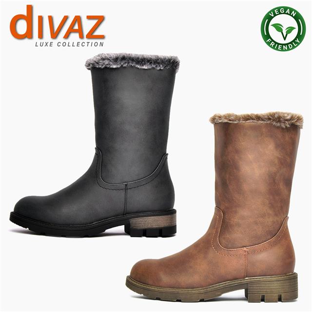 This winter warmer from the Divaz Luxe range of boots is crafted with a vegan friendly upper mixed with a warm faux fur and microfibre mix lining. This Nadia model can be worn with the utmost designer styling at full length or folded down to the ankle and is finished with a hidden inner elasticated size gusset for easy on / off wear. This highly durable and very fashionable boot has a grippy outsole for a steady foot wherever you go. This is high end fashionable footwear delivered to you at an affordable price and with a conscious choice too!