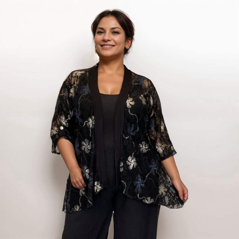 This jacket features 1/2 sleeves with button accents, an open neck design, and is proudly MADE IN THE UK. The accompanying packaging is crafted from recyclable materials, reflecting our commitment to sustainability. This chic piece is perfect for any party or evening occasion, offering a stylish and flattering option for plus size fashion. From Rockthosecurves, the ultimate destination for party wear with a conscience.