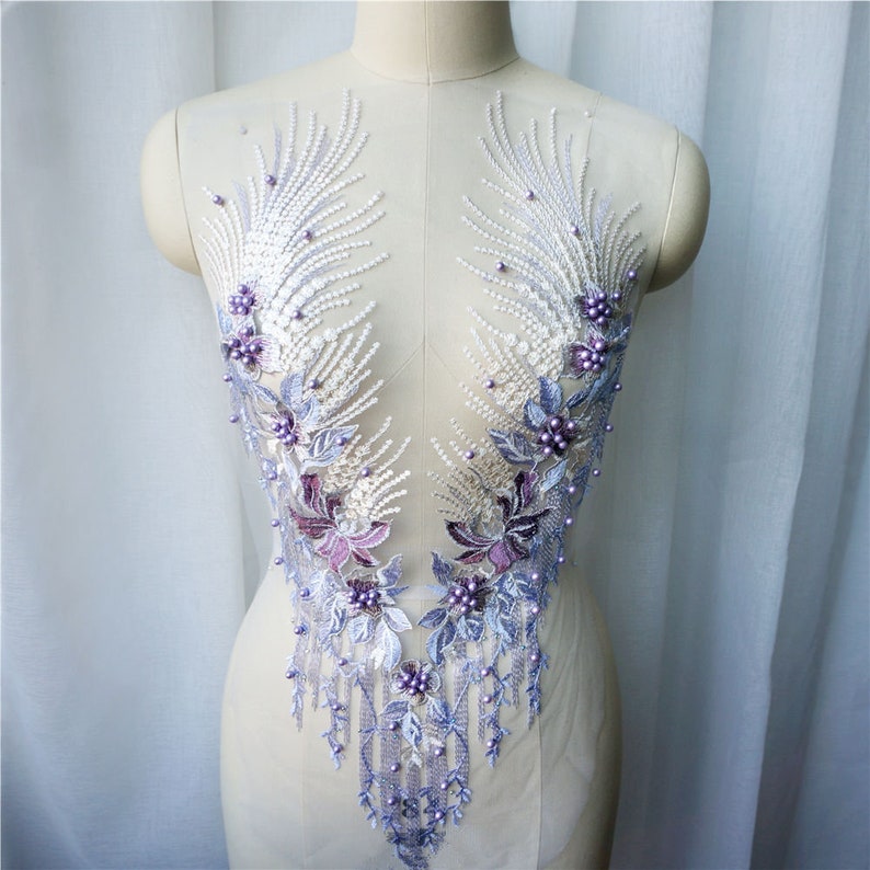 Luxurious embroidery lace applique, with hand beaded pearls, Sparkle Rhinestones. Perfect for bodice applique gown, ball gown, Pageant gown,