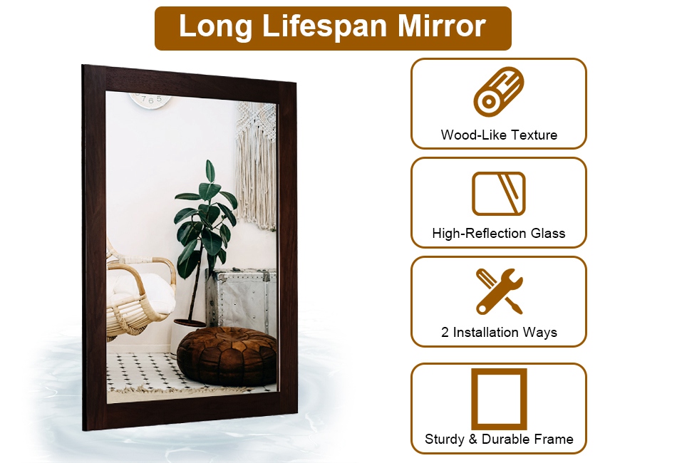 Our wall mirror offers 2 installation ways and perfectly meets your demands in different occasions. Rectangular shape and wood-like texture frame complements and well matches with most home decor style. Sturdy and durable PS material provides long term use. A perfect gift for ladies and girls in special days.