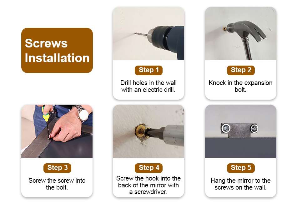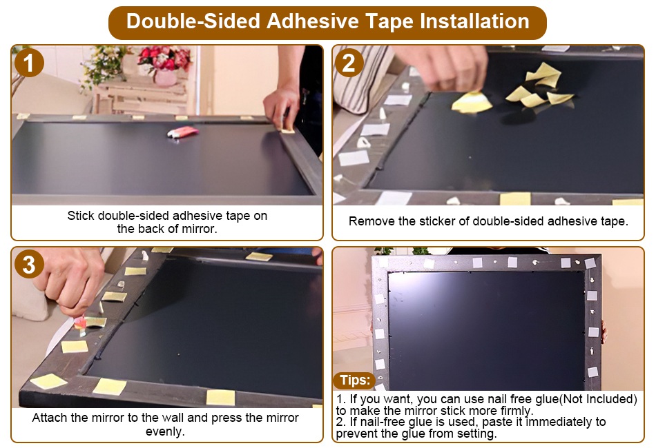 - Dual Installation Methods:Our wall mirror provides different ways of installation and you are capable to freely choose how to install it. Using screws is firmer,and double-sided adhesive tapes bring less harness to your wall.