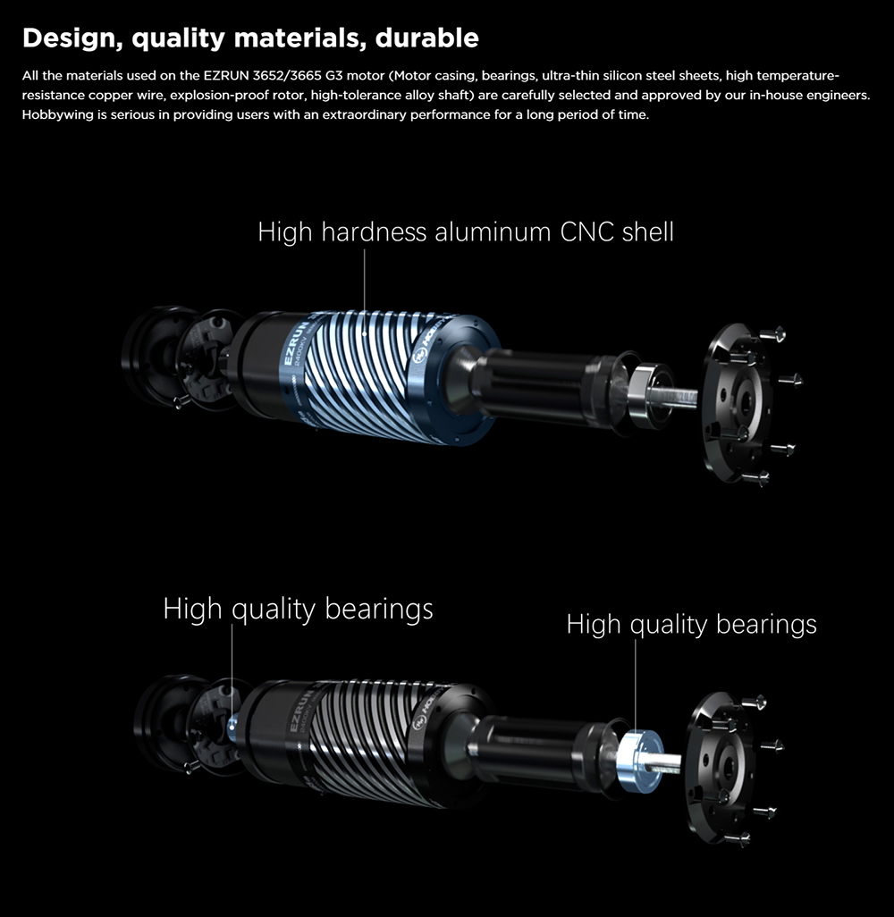 3.RC Motor Material: CNC machined aluminum housing, high purity copper windings, advanced rotor structure, 0.2mm silicon steel laminations, high-quality stainless steel output shaft, high-precision bearing for high durability and smoothness.