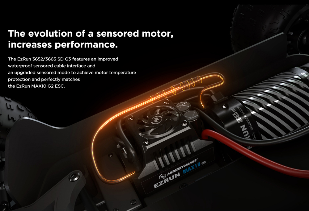 5.Sensored ESC: The Ezrun Max10 G2 features an improved waterproof sensored cable interface and an upgraded sensored mode to achieve a great sense of throttle response and perfectly matches the Ezrun 3652/3665 SD G3 motors.Note: Overheating protection is ONLY possible when it is paired with Hobbywing Ezrun, 3652 3665 G3 motor.