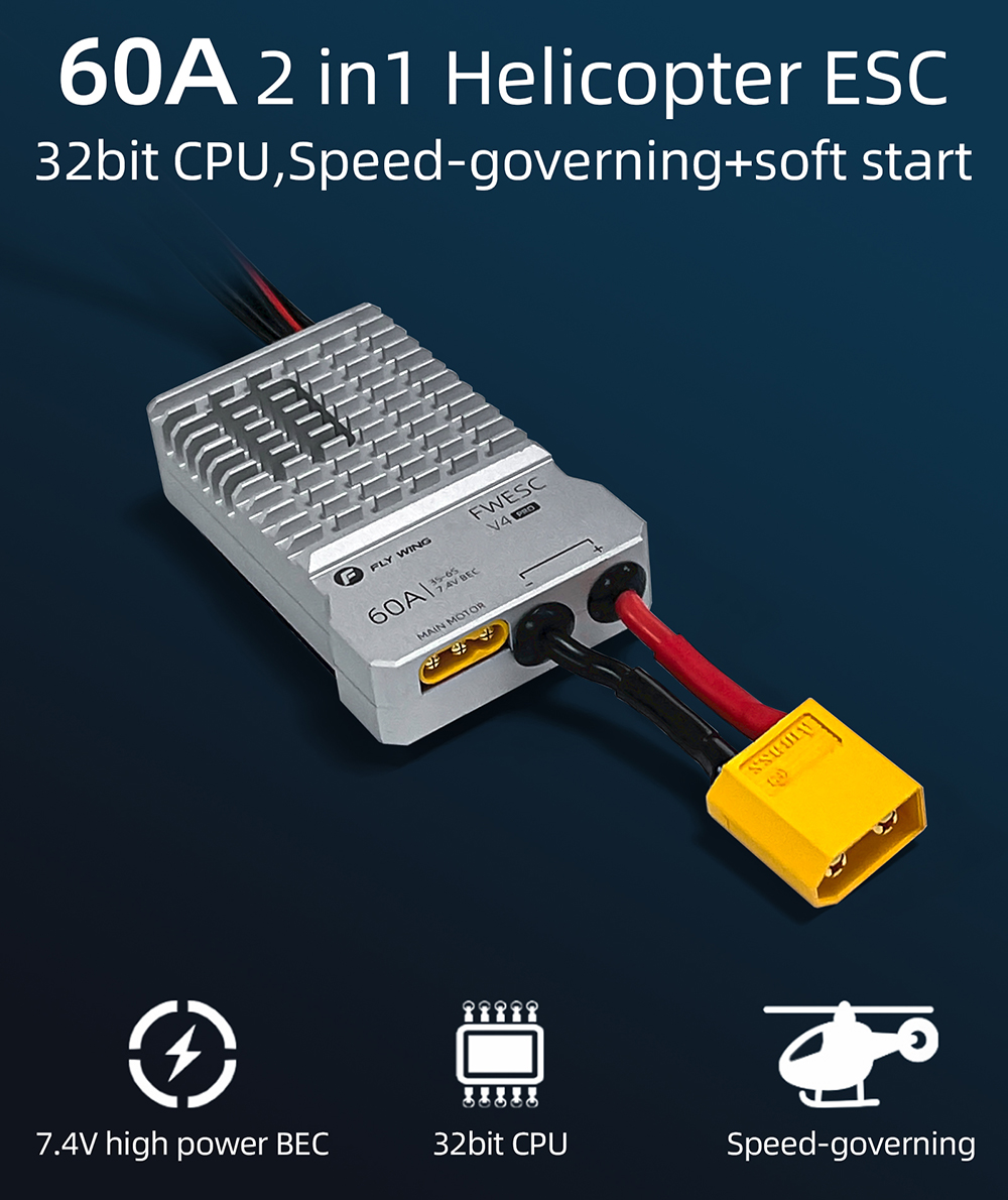1.Speed Controller: 3-6S 16V 60A Helicopter ESC ,32bit CPU , speed-governing + soft start,7.4v high power BEC ,32bit CPU