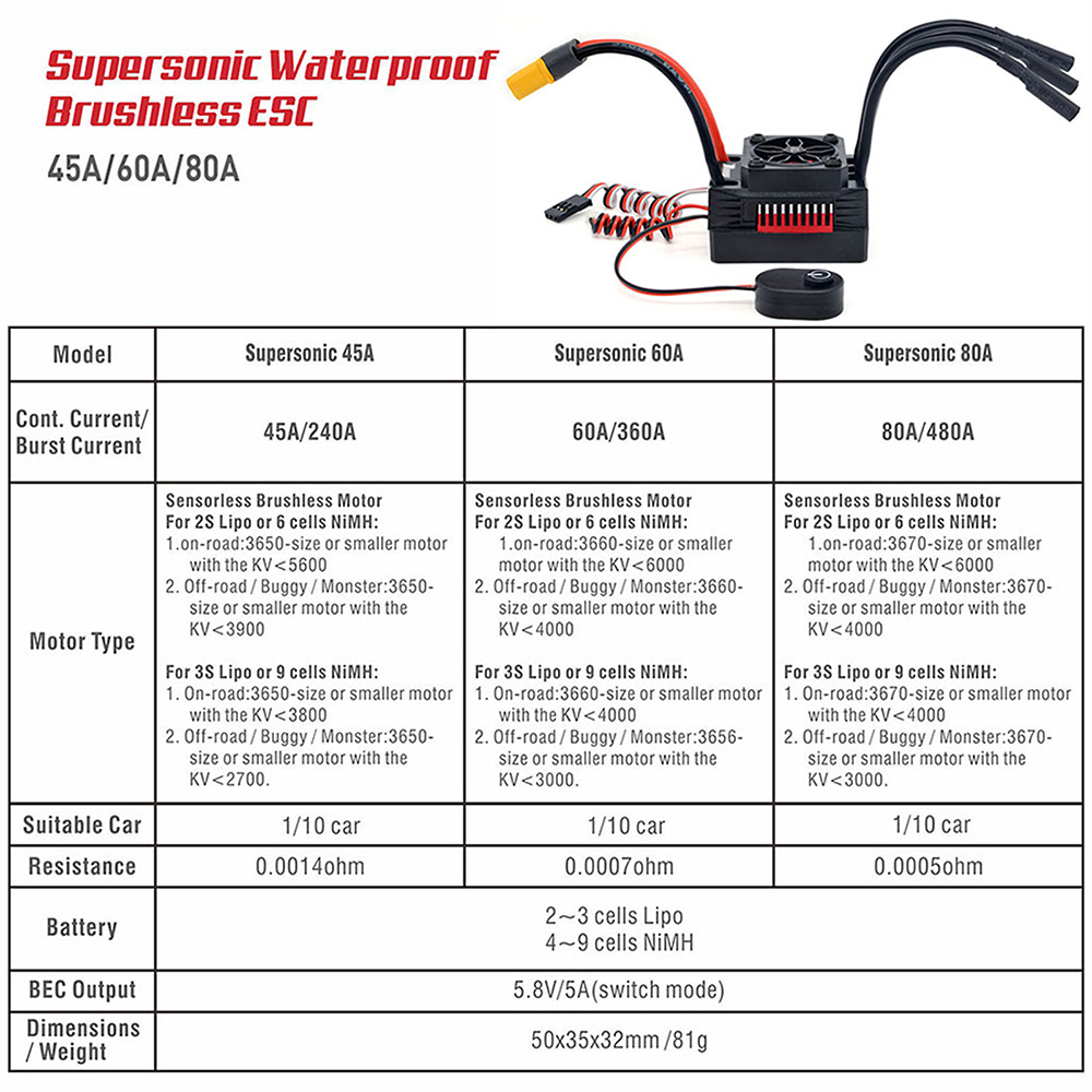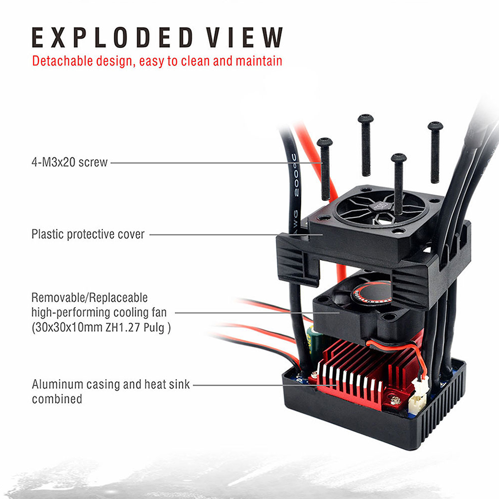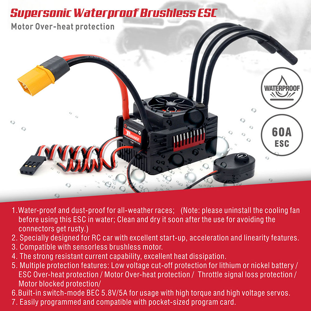 1.Water-proof and dust-proof for all-weather races; (Note: please uninstall the cooling fanbefore using this ESC in water; Clean and dry it soon after the use for avoiding the