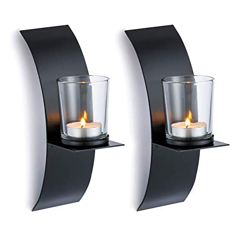 Tea light / votive candle sconces, made entirely of metal sheet. Curved, showing chic and modern . Add modern flair to your home decor, No matter for living room, bedroom, bathroom, dresser, entrance, hallway, They will complement your decor very well. The point is to find the proper site to hang them up. Specifications: Color: black Material: metal and clear glass Size: 20.5cm/8inch tall, 6cm/2.4inch wide for (battery operated) tea light or votive 5cm/2.5inchch less in diameter Package : 2 x metallic candleholder 2 x glass candle cup 2 x nails Note: please never leave lit candle unattended.