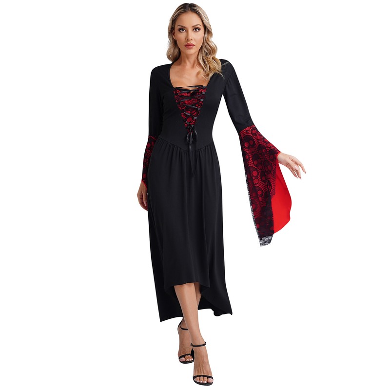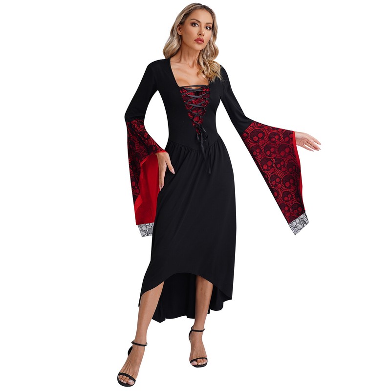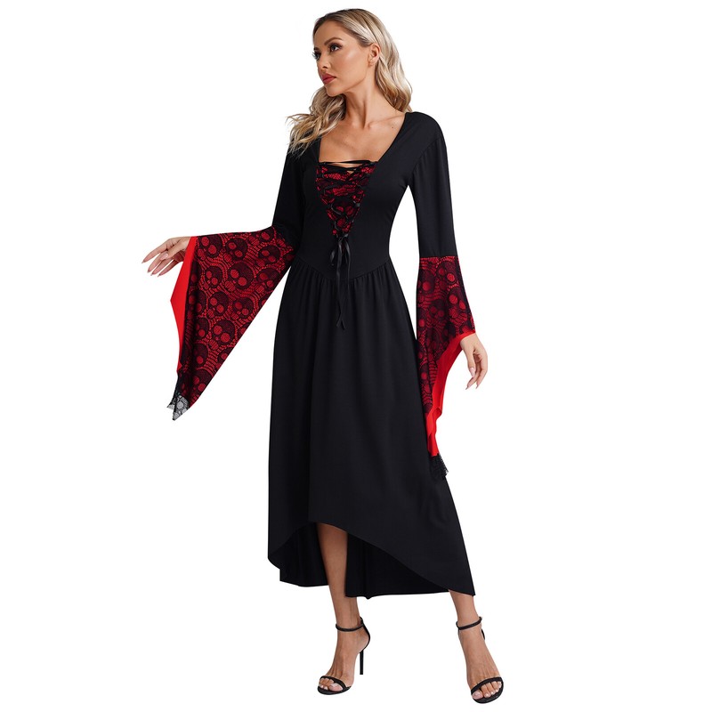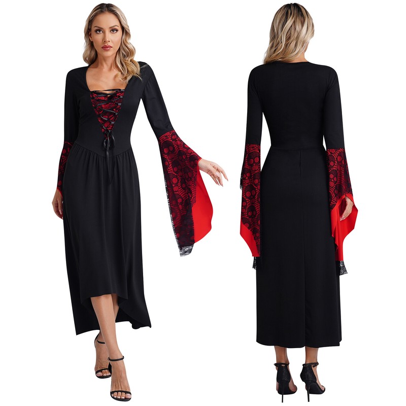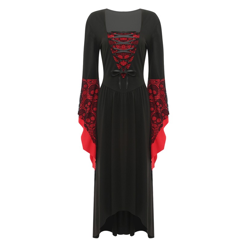 Skull lace splices on the chest and the bottom of flare sleeve, asymmetrically layering style, adding weird and scary feeling.