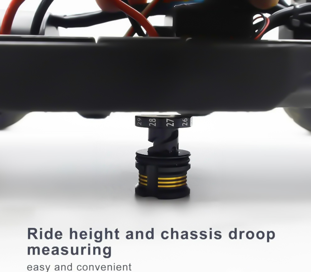 2. Ride height and chassis droop measuring, easy and convenient. Marked with a clear size and scale for easy identification and use. Measures ride height from 20mm to 30mm.