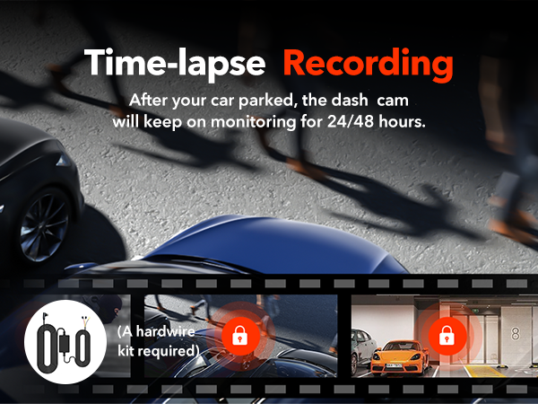 24H PARKING MONITOR/G-SENSOR/GUIDELINES/LOOP RECORDING - ❶ Up to 48 hours of parking monitoring, acts as a surveillance camera system when the vehicle is off; ❷ Automatic video recording and locking when a collision is detected; ❸ Backup camera display with guidelines assist you safe parking; ❹ Loop recording of the cam front and rear mirror allows continuous recording when the memory SD card is full.