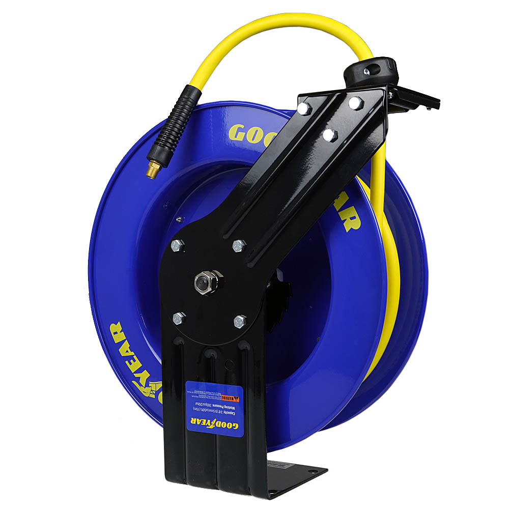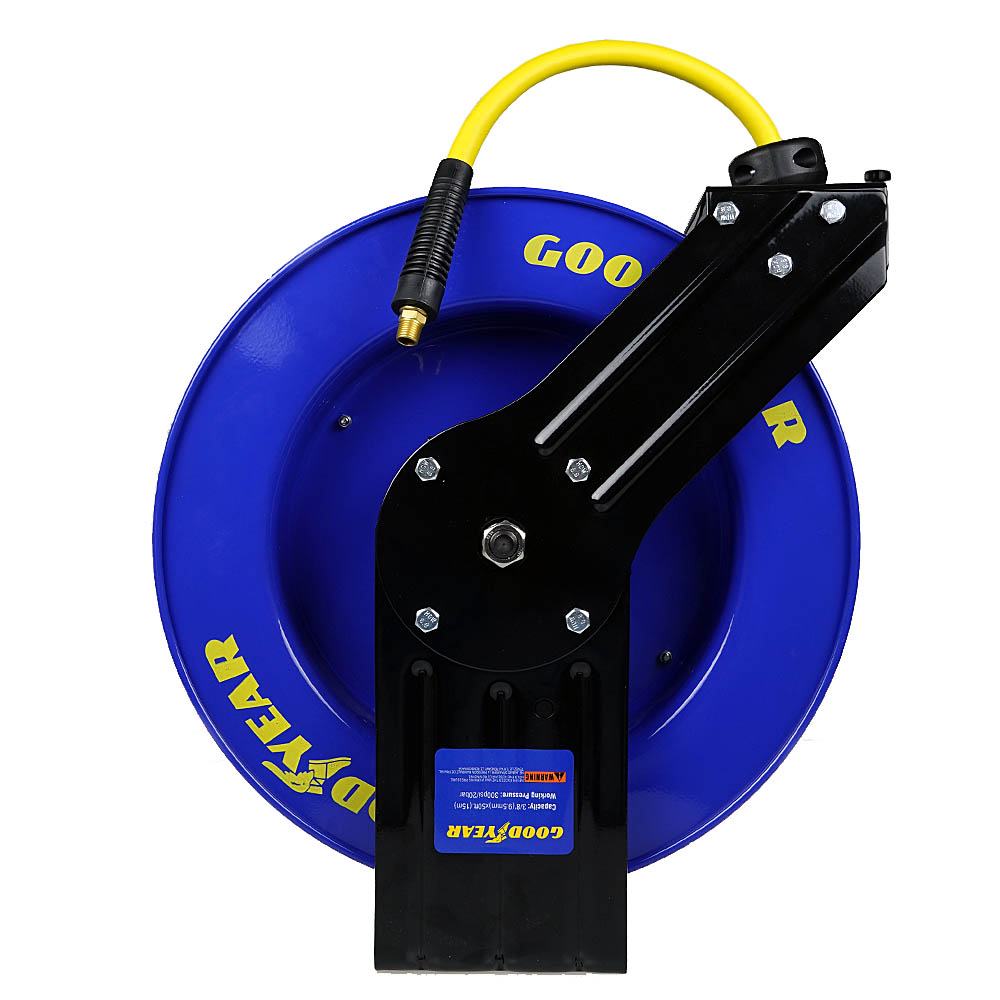 Goodyear 3/8" x 50' self-retracting air hose reel. This hose reel features professional-grade all-steel construction, a heavy-duty single-sided arm, and a 4-roller hose guide. The 8-position ratchet securely locks the hose when pulled out and the versatile adjustable guide arm allows this hose to be mounted to a wall or ceiling. This reel comes with a Goodyear flexible hose rated for 300 PSI, has 1/4" male NPT ends, and is made in Germany.