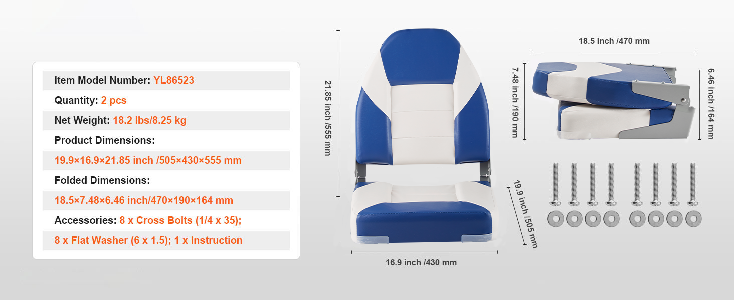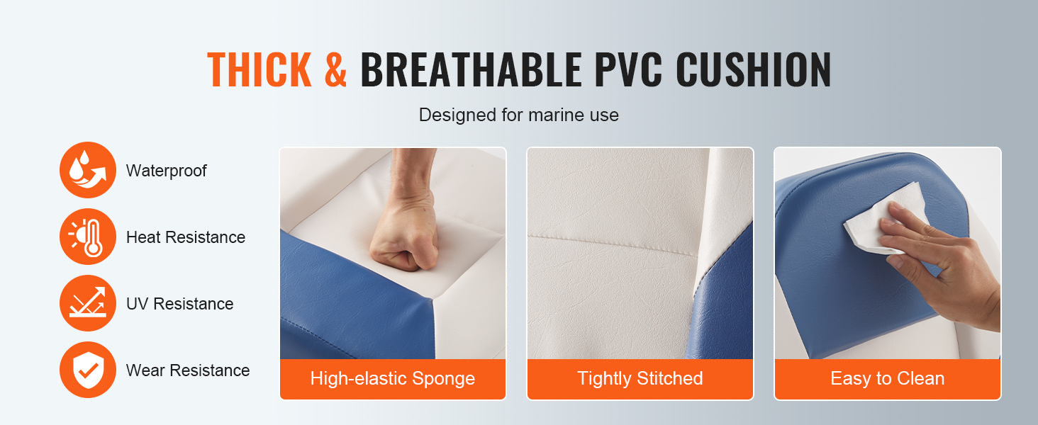 Crafted with PVC leather and elastic sponge, our pontoon boat seats are built to withstand the marine environment. They're waterproof, UV, and tear-resistant, ensuring the fishing boat seats withstand sun, rain, and sea conditions. Plus, they're easy to clean and take less time for maintenance.