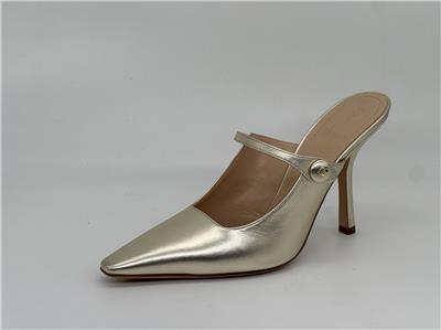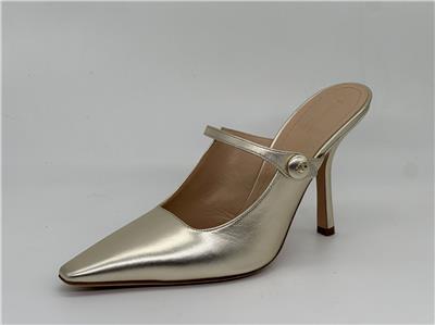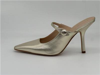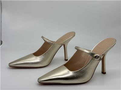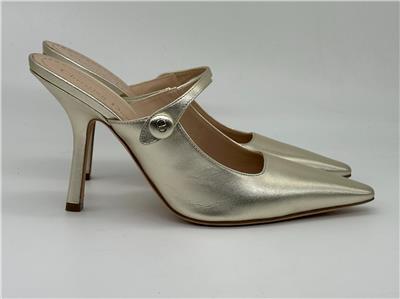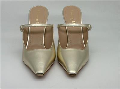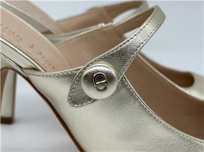 The laminated lambskin leather heeled mule sandal. A leather strap with a decorative button with a gold-tone CD signature and 10 cm comma heel add the finishing touch to the refined shoe.