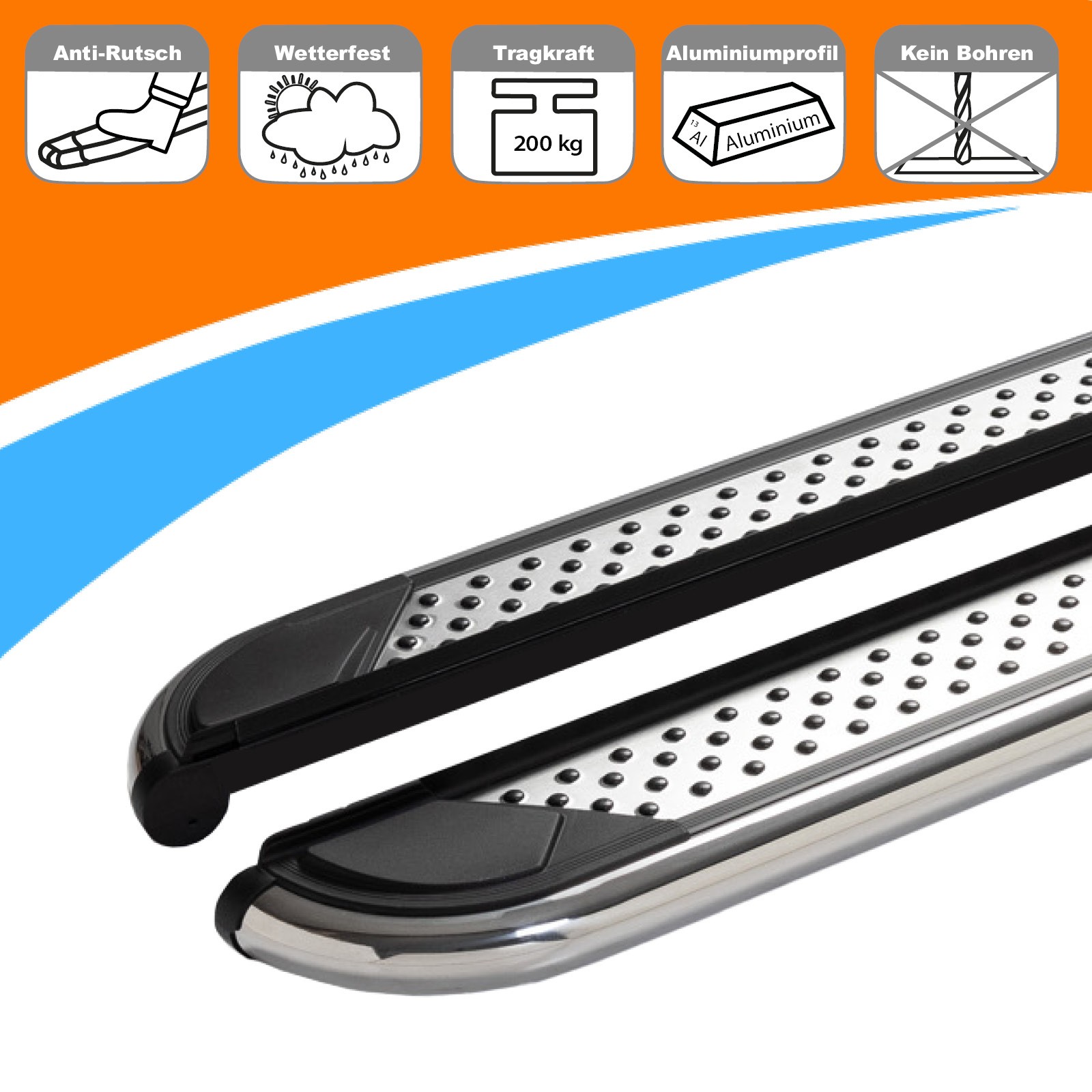 Unsere Trittbretter sind der perfekte Weg, um sicher und bequem in Ihr Fahrzeug ein- und auszusteigen. Mit einer Tragkraft von über 200 kg sind sie besonders robust und langlebig. Sie verfügen über eine Antirutsch-Funktion, um das Risiko von Unfällen zu minimieren, und sind aus hochfestem Aluminium gefertigt, um sie widerstandsfähig und langlebig zu machen.