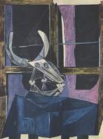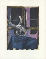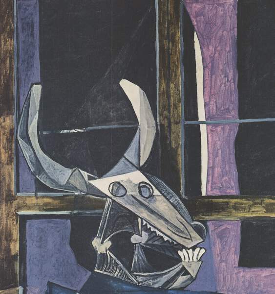 Additional Details: Still Life with Ox Skull was painted by Pablo Picasso in 1942 during his World War II or War Period. This period was marked by somber and darker themes, reflecting the impact of the war and the personal challenges Picasso faced during the Nazi occupation of Paris. The ox skull is often interpreted as a symbol of death and mortality, which was a prevalent theme in his works during this time. Still Life with Ox Skull is a printed on high-quality 250g paper with deckled edges with full margins, published by Achenbach Art Edition in Düsseldorf.