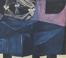 Sku: YY4908Artist: Pablo PicassoTitle: Still Life with Ox SkullYear: 1990Signed: NoMedium: Offset LithographPaper Size: 19.75 x 15.75 inches ( 50 x 40 cm )Image Size: 14.75 x 11 inches ( 37 x 28 cm )Edition Size: 500Framed: No: Inquire with our experts for framing suggestions.Condition: A: MintAdditional Details: Still Life with Ox Skull was painted by Pablo Picasso in 1942 during his World War II or War Period. This period was marked by somber and darker themes, reflecting the impact of the war and the personal challenges Picasso faced during the Nazi occupation of Paris. The ox skull is often interpreted as a symbol of death and mortality, which was a prevalent theme in his works during this time. Still Life with Ox Skull is a printed on high-quality 250g paper with deckled edges with full margins, published by Achenbach Art Edition in Düsseldorf.