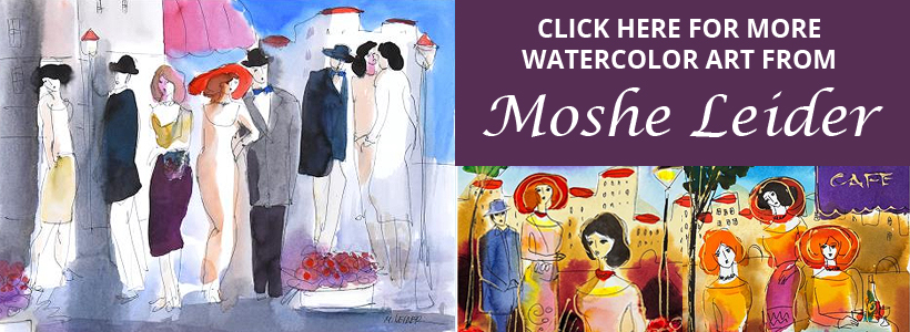 This is an original mixed media watercolor painting on paper by Moshe Leider. Hand signed by the artist, this piece comes custom framed and includes a Letter of Authenticity. Measures approximately 15" x 13.5" (frame), 8" x 6.5" (image).