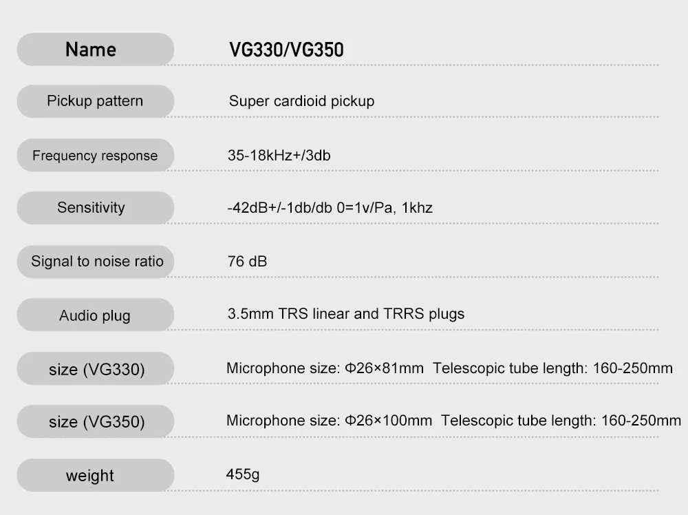 | Polar pattern: | Cardioid-BY-VG330 Super-cardioid-BY-VG350 |