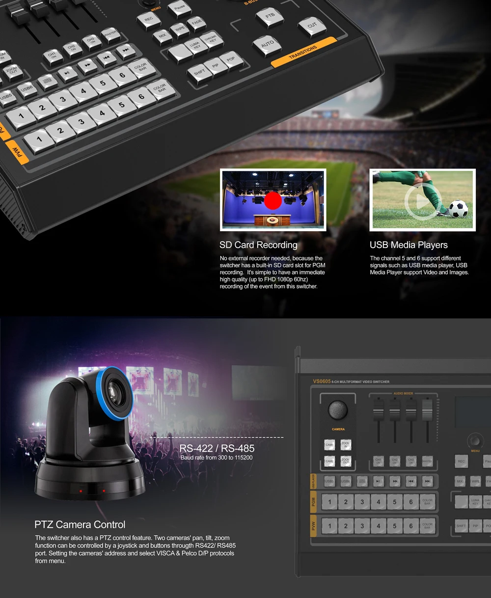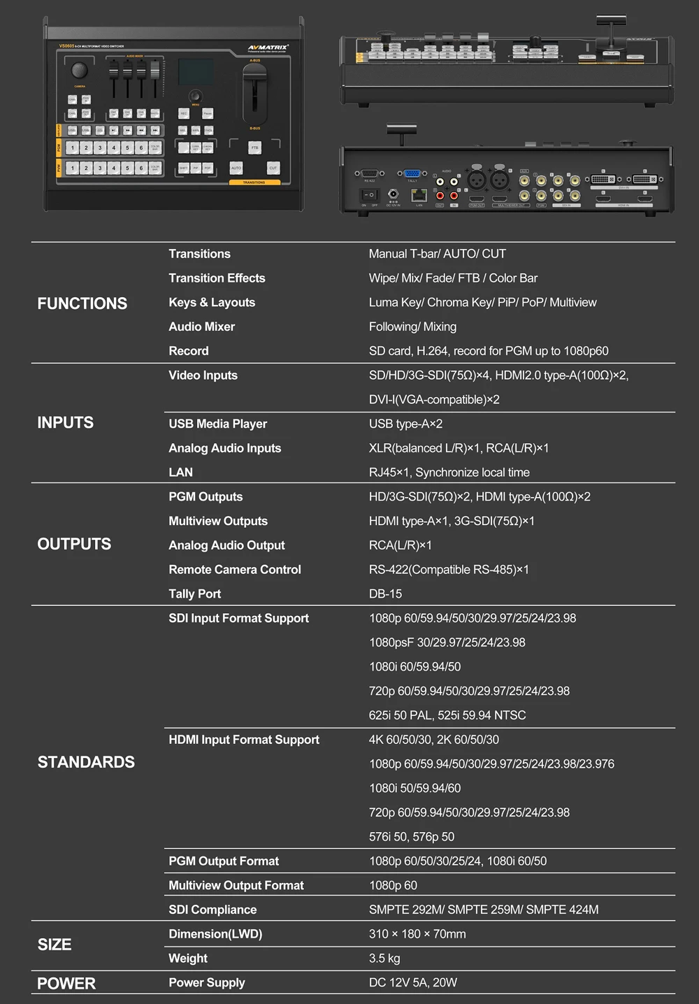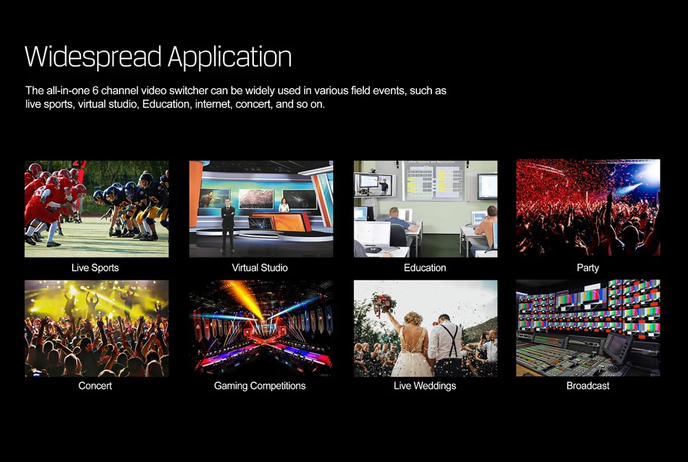 6 channel inputs: 4×SDI and 2×DVI-I/ HDMI/ VGA/ USB player inputs