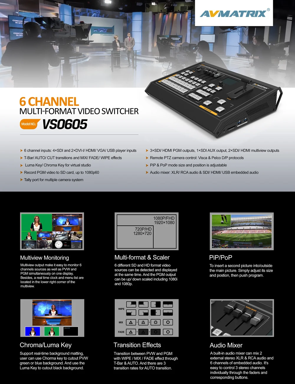 AVMATRIX VS0605 SDI/HDMI 6 Channel Multi-Format Video Switcher with PGM Recorder