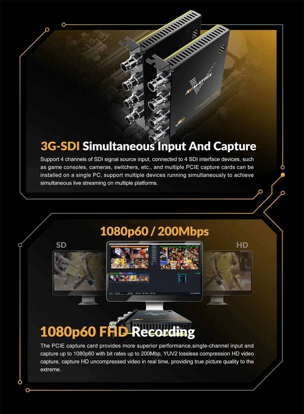 2.Input and capture up to 1080p60, bit rate up to 200Mbps 3.Support YUY2 uncompressed video 4.PCIE GEN2×4, 2.5GB/S transfer bandwidth 5.Support portrait and landscape mode 6.Compatible with Windows 7 and above, Linux 18.04 and above 7.Compatible with OBS/potplayer/XSplit and other live recording software 8.Stable operation, 24 hours non-stop work 9.Support one machine with multiple cards working simultaneously