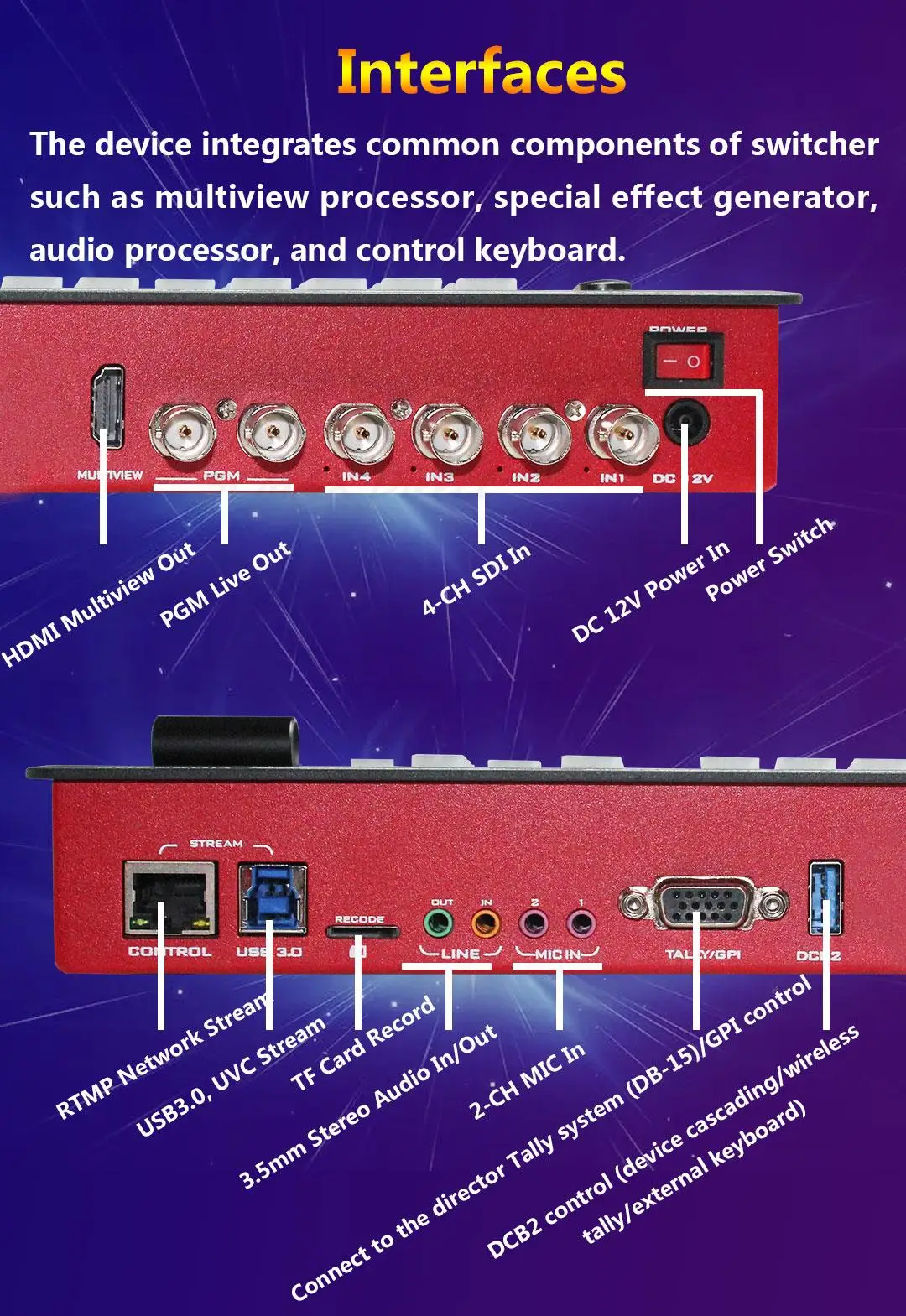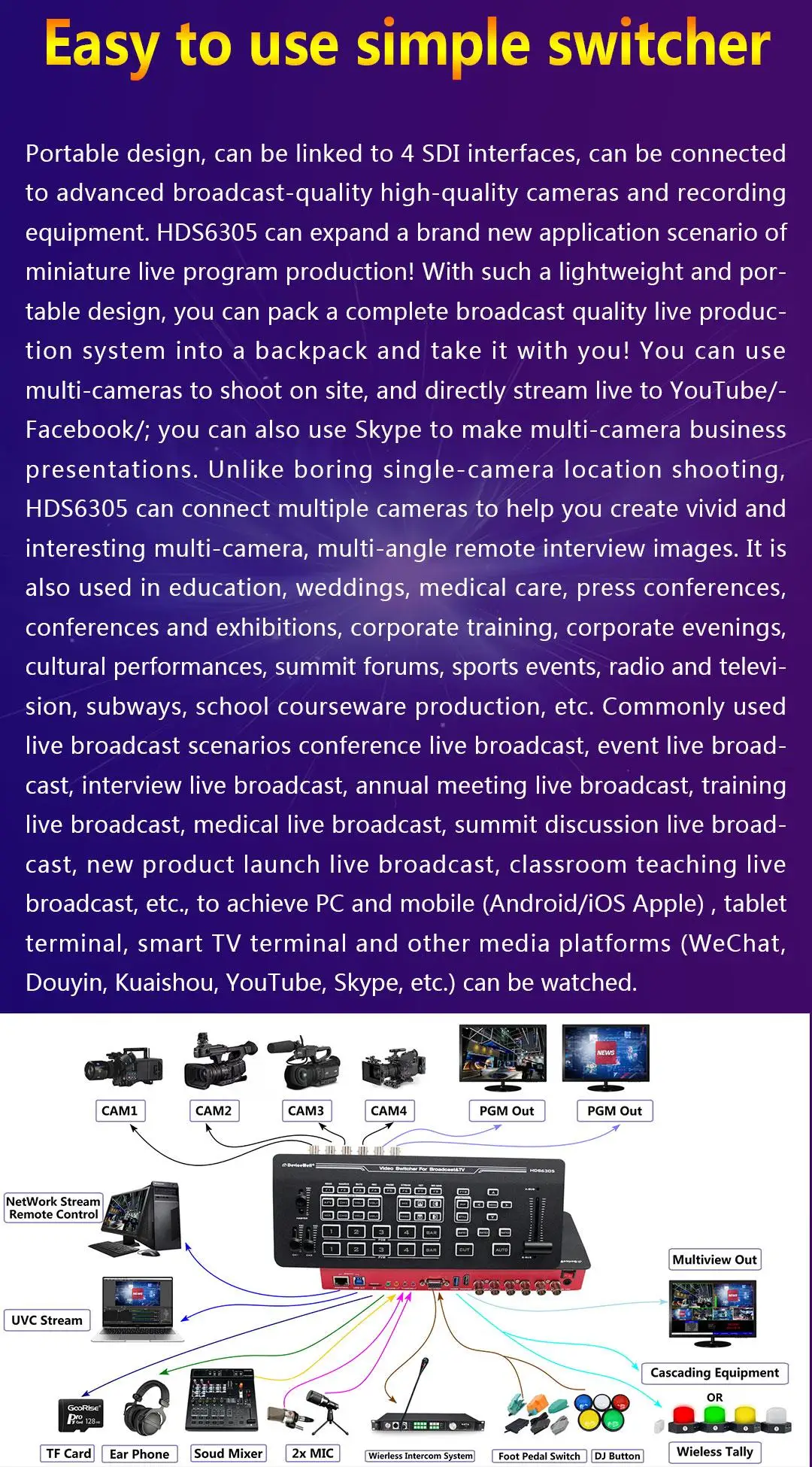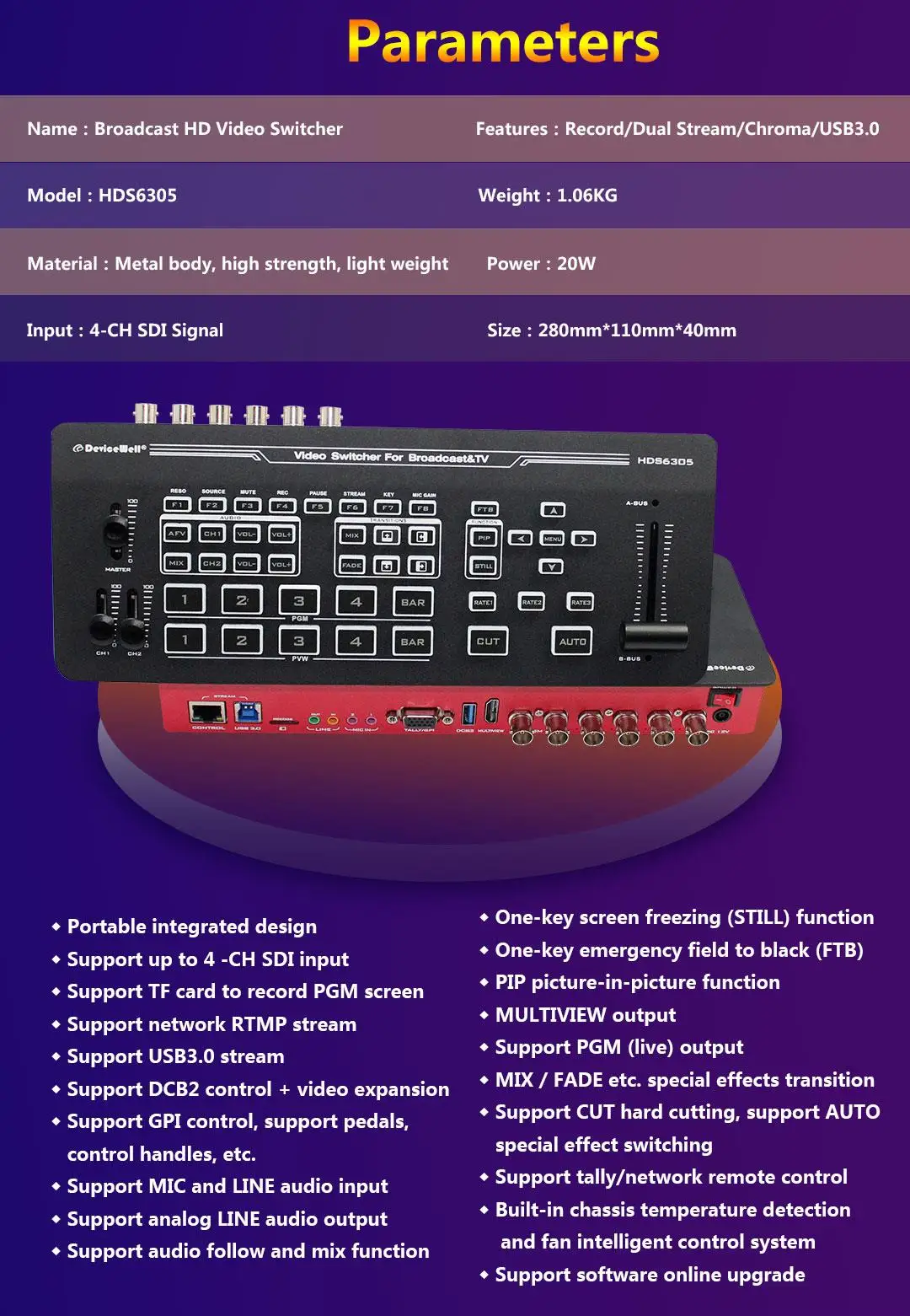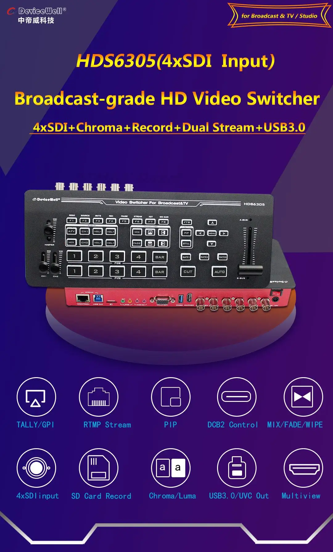Devicewell HDS6305 4-CH SDI Input Chroma Video Switcher for Broadcast TV Studio