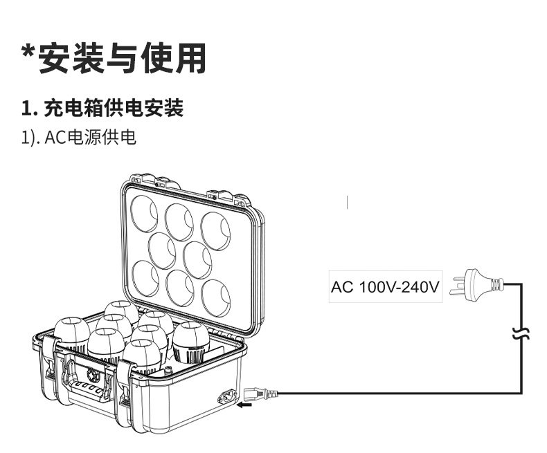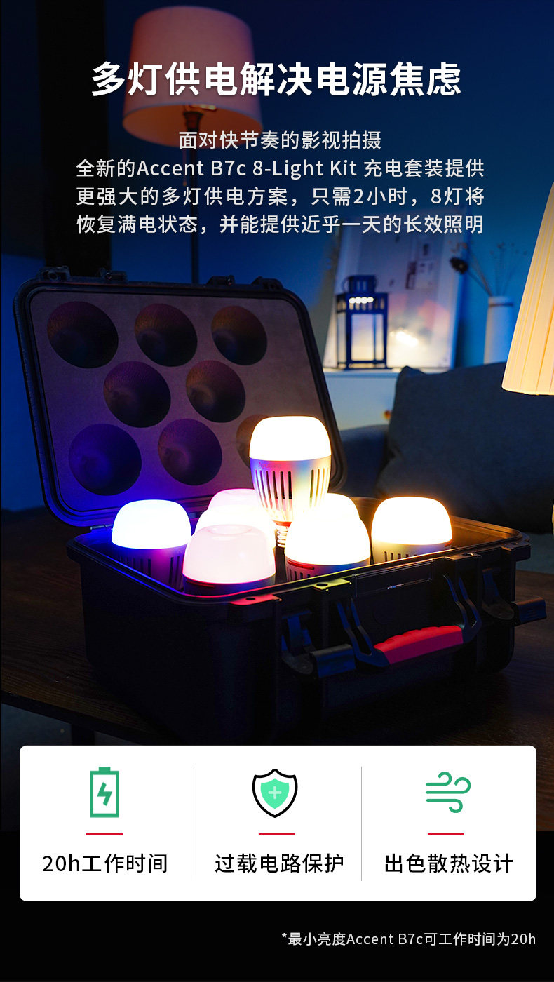 Only one charging box is needed to supply power for eight lamps at the same time, and all lamps can be restored to full power in two hours and provide long-lasting lighting for nearly one day*. (*Minimum brightness Accent B7c can work for 20h)