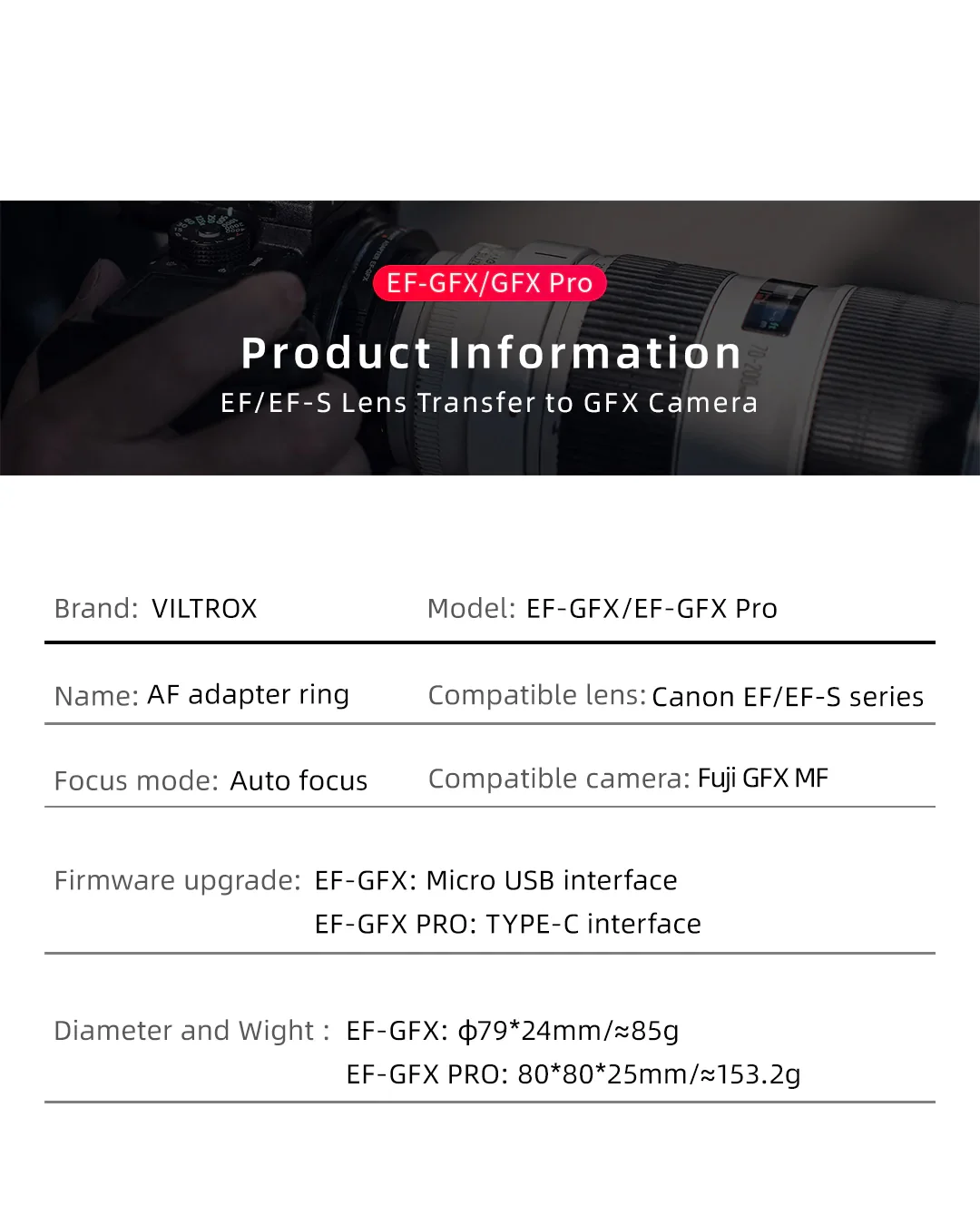 Viltrox EF-GFX Pro AF Lens Adapter for Canon EF EF-S Lens to Fuji GFX 100S 50SII
