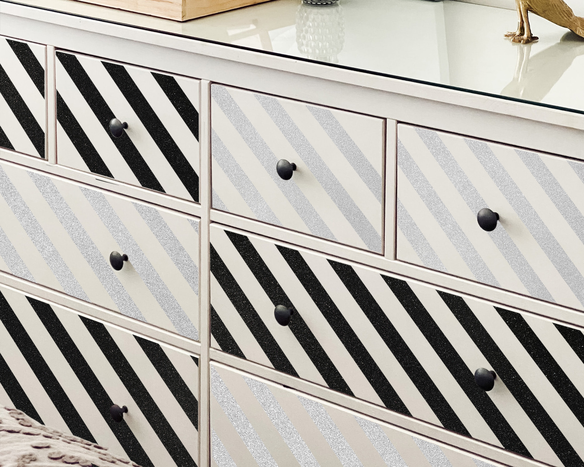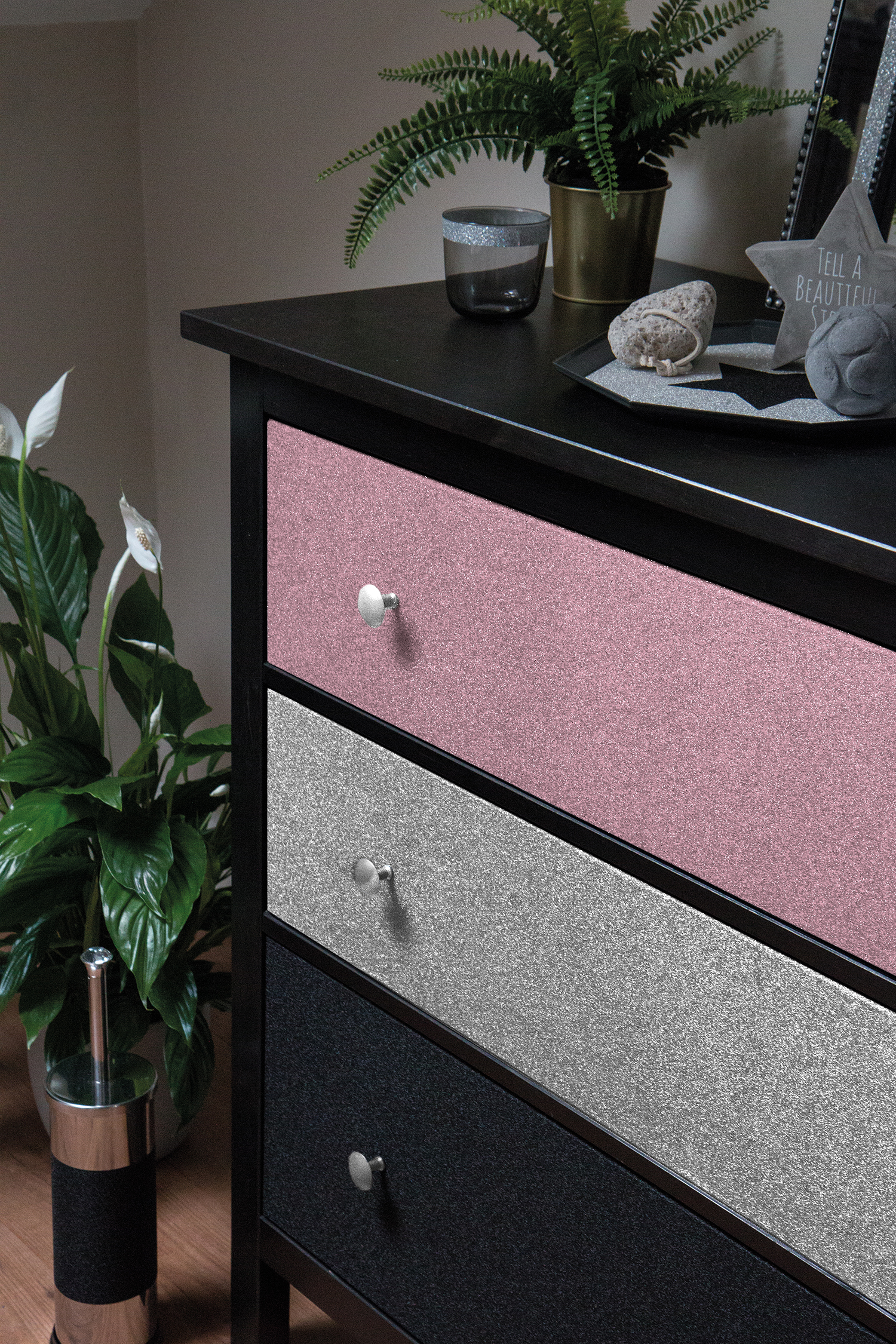 Wir bieten hochwertige selbstklebende Dekorfolie Brokat an, ideal geeignet zur Verschönerung kleiner Flächen. Diese Glitzerfolie eignet sich hervorragend zur Verzierung von Schubladenfronten, Spiegeln, Bilderrahmen, Aufbewahrungsboxen, Schmuckkästchen, Accessoires oder kleinen Schreibtischkommoden.