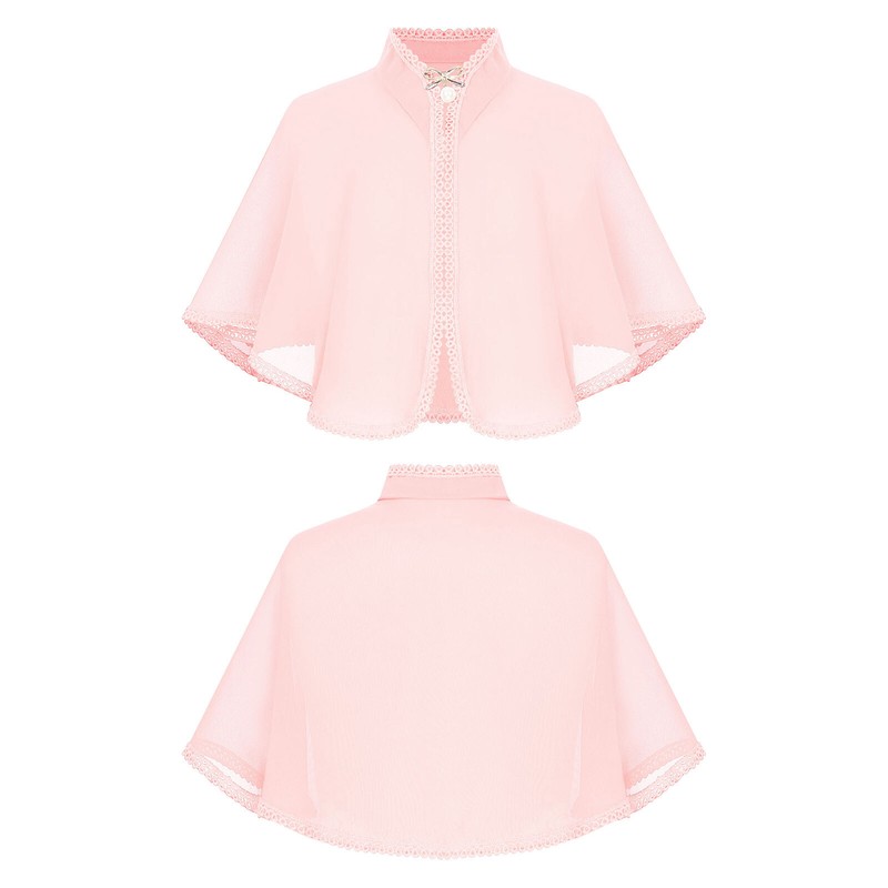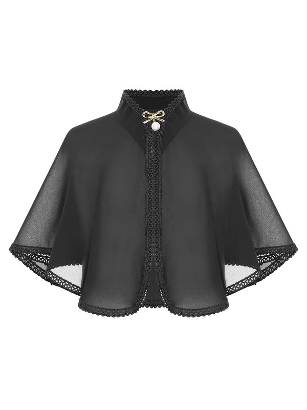 Cape designs with stand collar, lace trims and solid color, comes with a brooch with exquisite bow and faux pearls decoration.